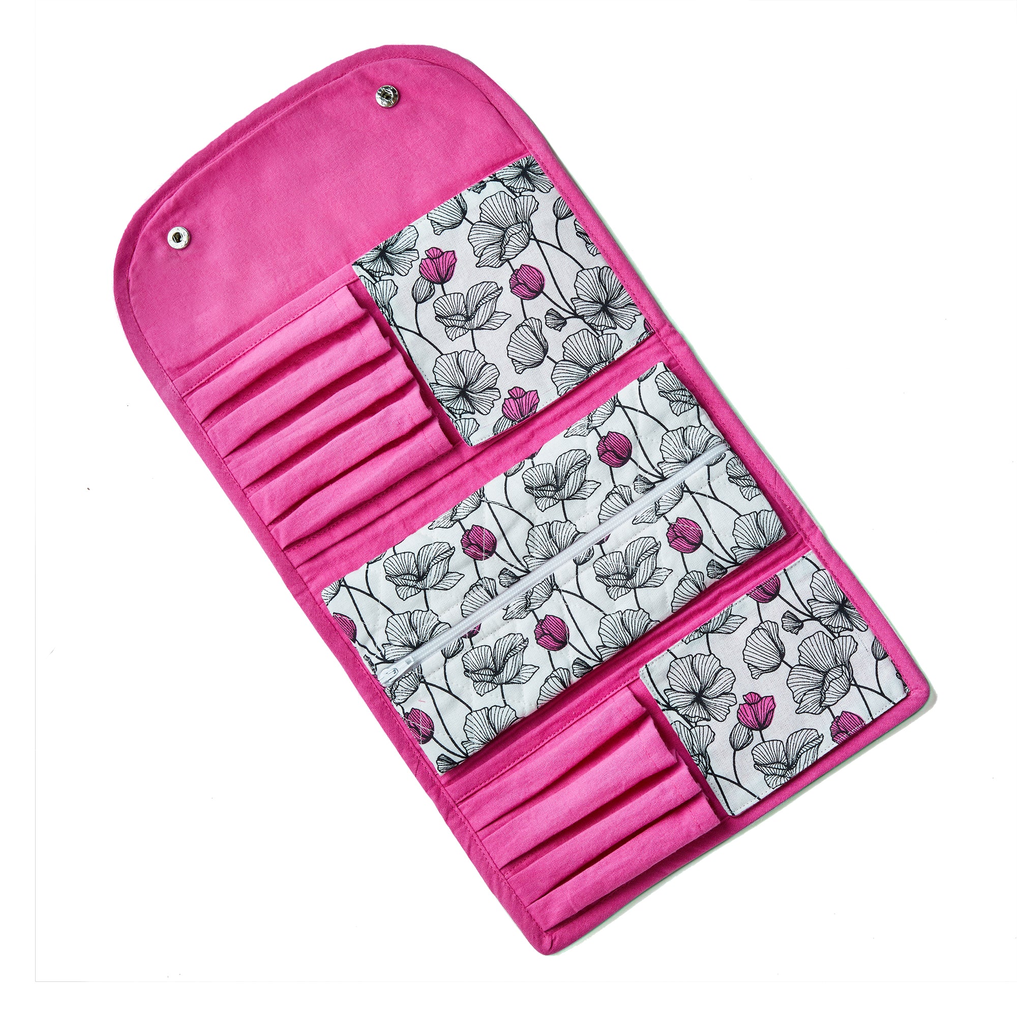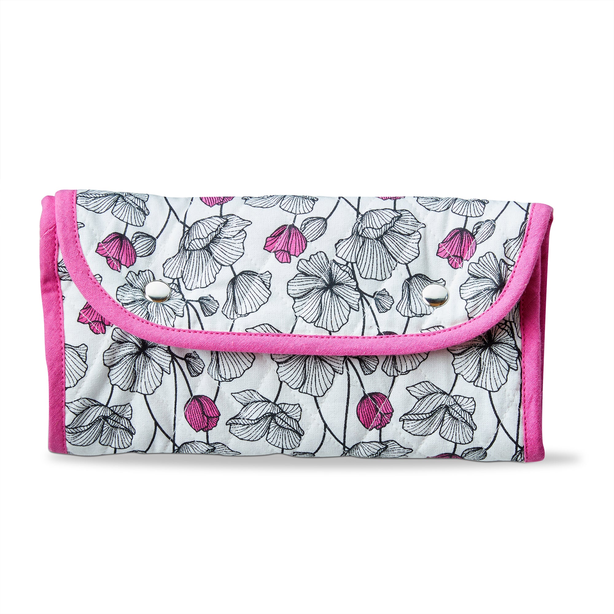 Compact roll-up pouch organizes brushes, skincare, and jewelry with three see-through pockets. Cotton exterior and snaps keep everything secure. View all items in Oh So She.