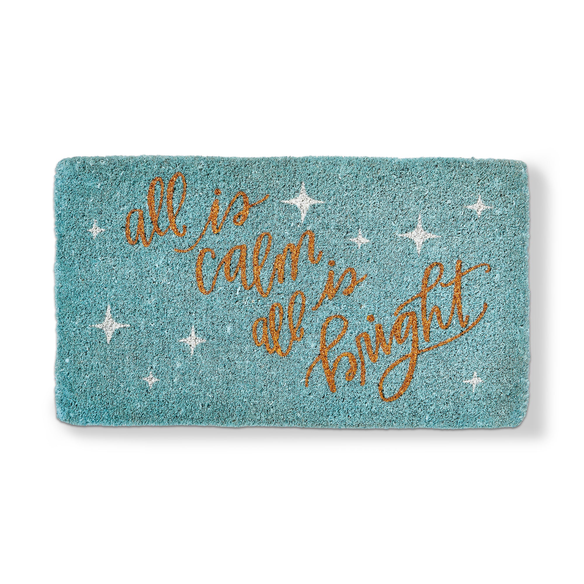 Teal coir mat hand painted with an all is calm all is bright message accented with glittering stars. Durable coir fibers help keep entryways clean while adding cheerful holiday charm. Perfect for protected porches. Hand painted details add warmth while its versatile design makes styling simple. Sized for layered displays and pairs beautifully with seasonal greenery and décor.