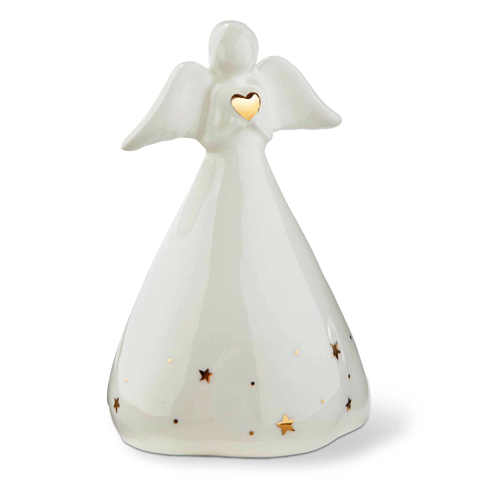 Angel bell decor piece with sculpted robe and gentle bell shape. Soft white finish makes it a peaceful accent for shelves, mantels, or tabletops. Hand painted details add warmth while its versatile design makes styling simple. Sized for layered displays and pairs beautifully with seasonal greenery and décor.