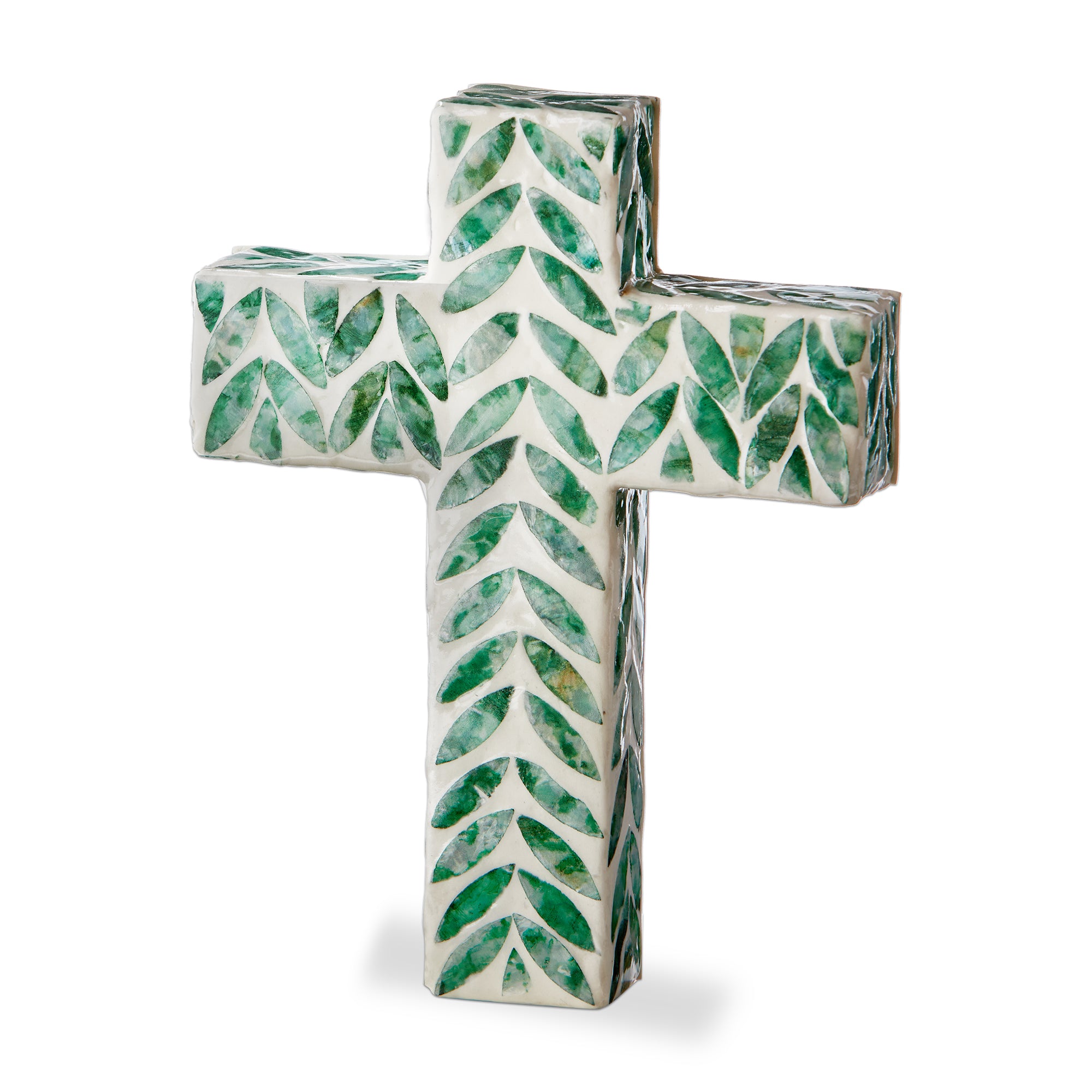 Capiz shell cross hanging decor piece with soft green patterning that adds a serene, reflective accent to walls or entryways. Lightweight and easy to display. Hand painted details add warmth while its versatile design makes styling simple. Sized for layered displays and pairs beautifully with seasonal greenery and décor.