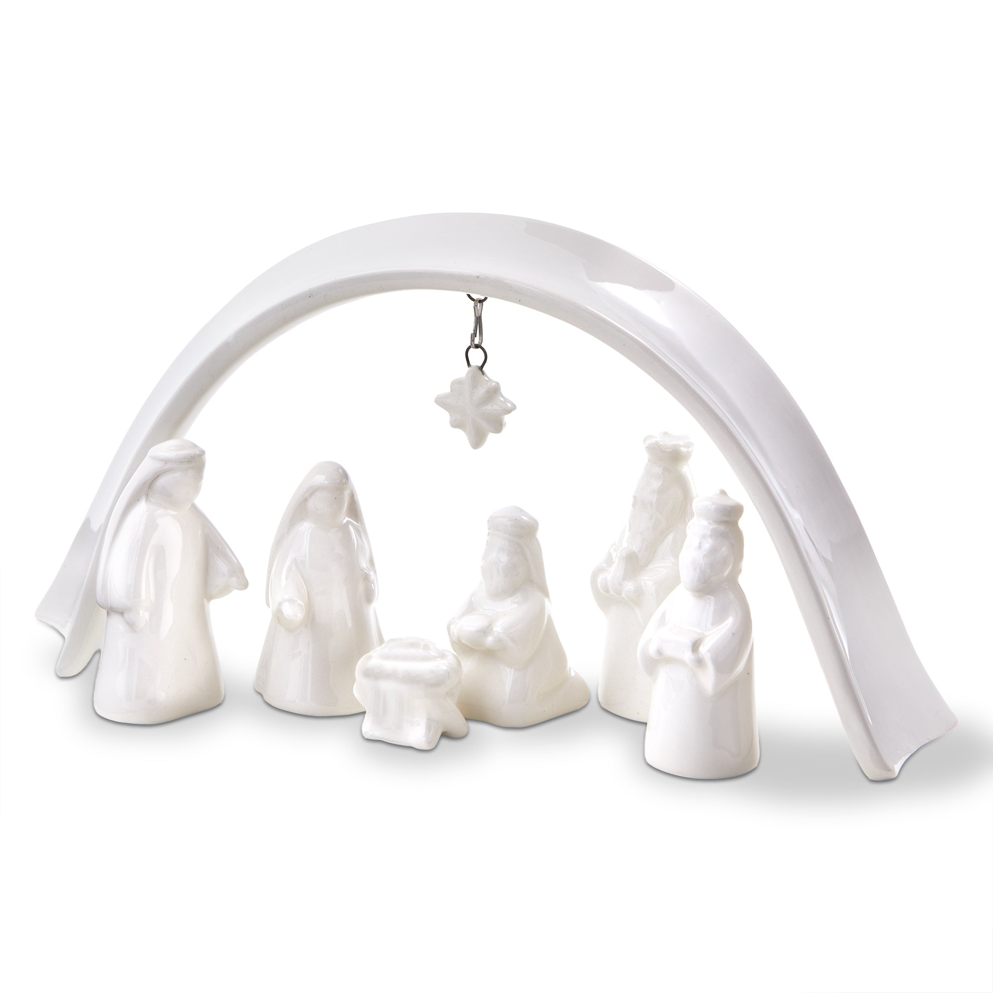 Large ceramic nativity scene set with arch and seven figurines. Neutral white finish blends with any palette and creates a serene centerpiece on consoles or mantels. Hand painted details add warmth while its versatile design makes styling simple. Sized for layered displays and pairs beautifully with seasonal greenery and décor.