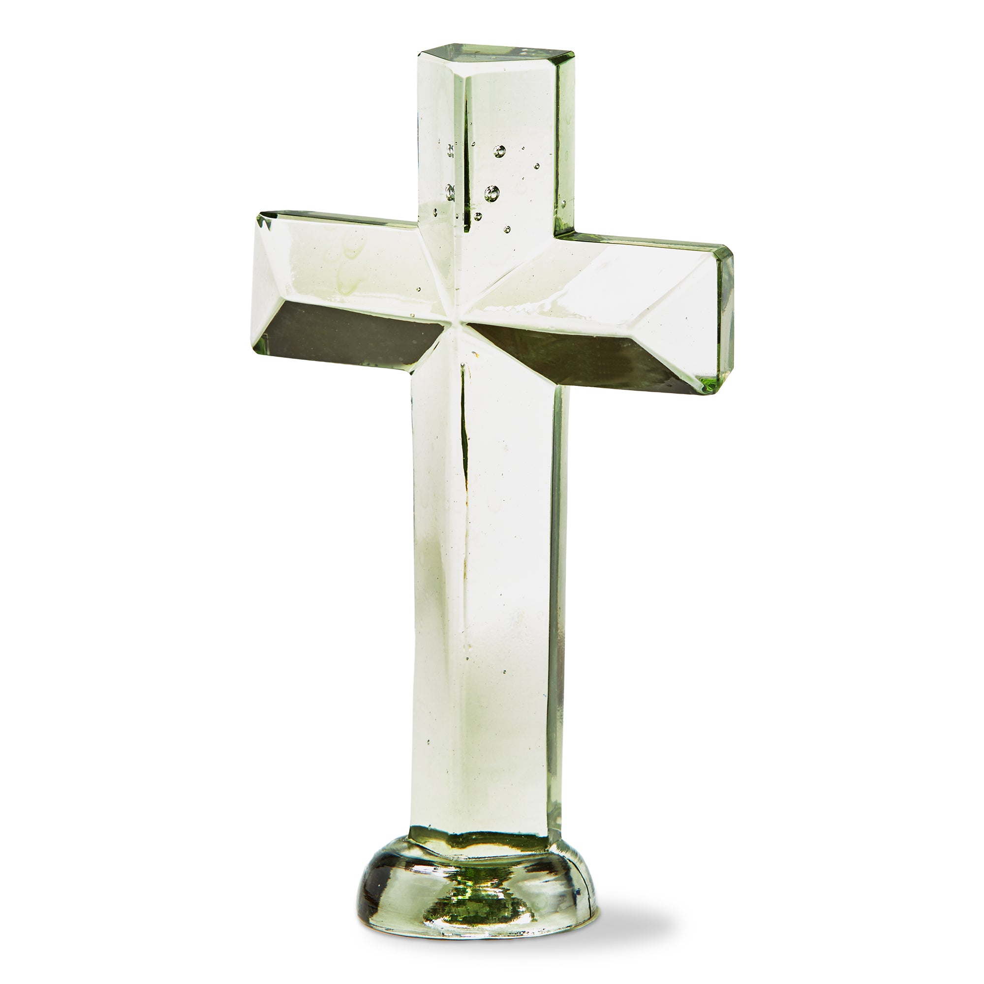 Light green glass cross décor piece that adds soft reflective shine to shelves, mantels, and inspirational home settings. Handcrafted details bring an uplifting touch. Hand painted details add warmth while its versatile design makes styling simple. Sized for layered displays and pairs beautifully with seasonal greenery and décor.