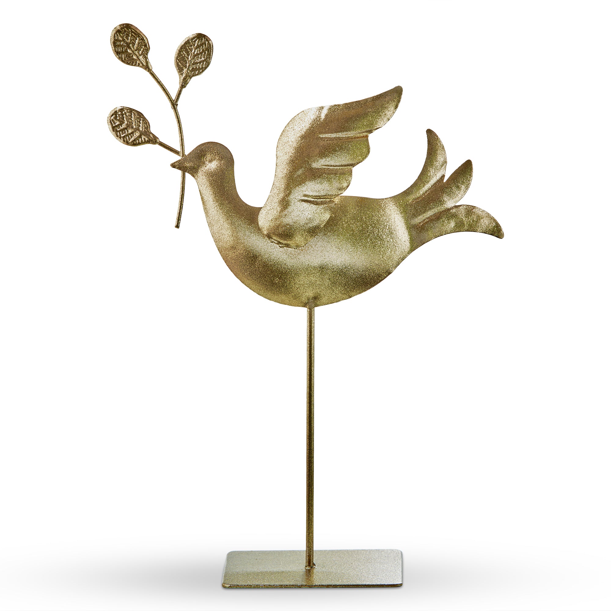 Sculptural gold dove decor piece with outstretched wings perched on a stand. Display on mantels or consoles to bring a peaceful note to seasonal vignettes. Hand painted details add warmth while its versatile design makes styling simple. Sized for layered displays and pairs beautifully with seasonal greenery and décor.