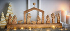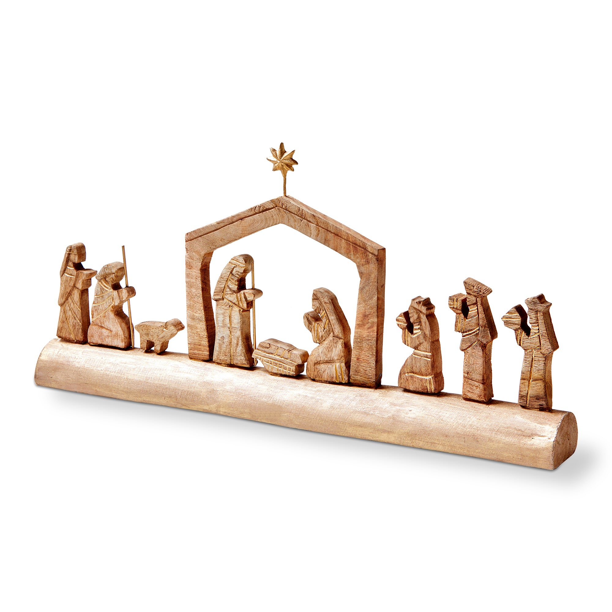 Nativity scene on a carved wood log, combining natural mango wood with metal figures. This long silhouette makes a striking centerpiece for mantels or buffet tables. Hand painted details add warmth while its versatile design makes styling simple. Sized for layered displays and pairs beautifully with seasonal greenery and décor.