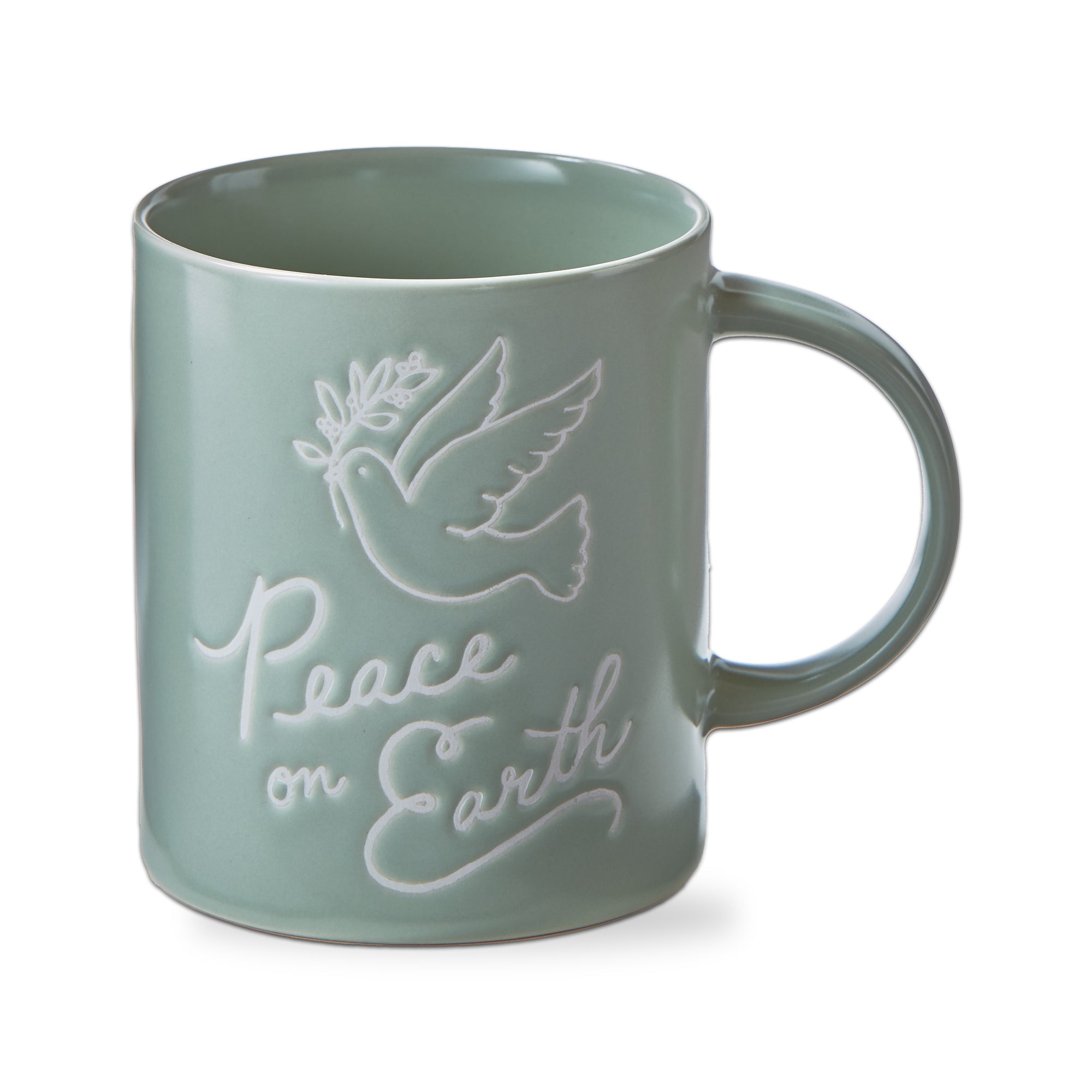 Peace on Earth mug with a serene dove motif and gentle wax resist design. A meaningful seasonal favorite for gifting, cocoa bars, or peaceful holiday morning moments. Hand painted details add warmth while its versatile design makes styling simple. Sized for layered displays and pairs beautifully with seasonal greenery and décor.