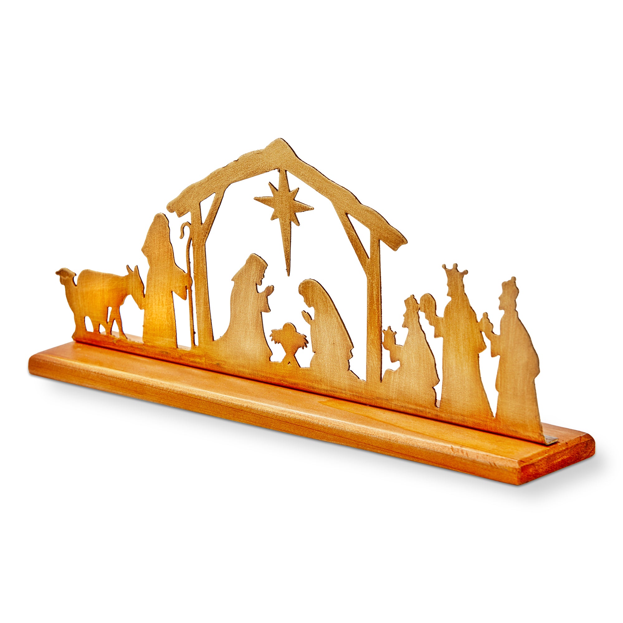 Wood and metal nativity scene decor piece with silhouetted figures and stable. Compact yet detailed, it fits easily on mantels, shelves, or side tables for a simple faith filled display. Hand painted details add warmth while its versatile design makes styling simple. Sized for layered displays and pairs beautifully with seasonal greenery and décor.