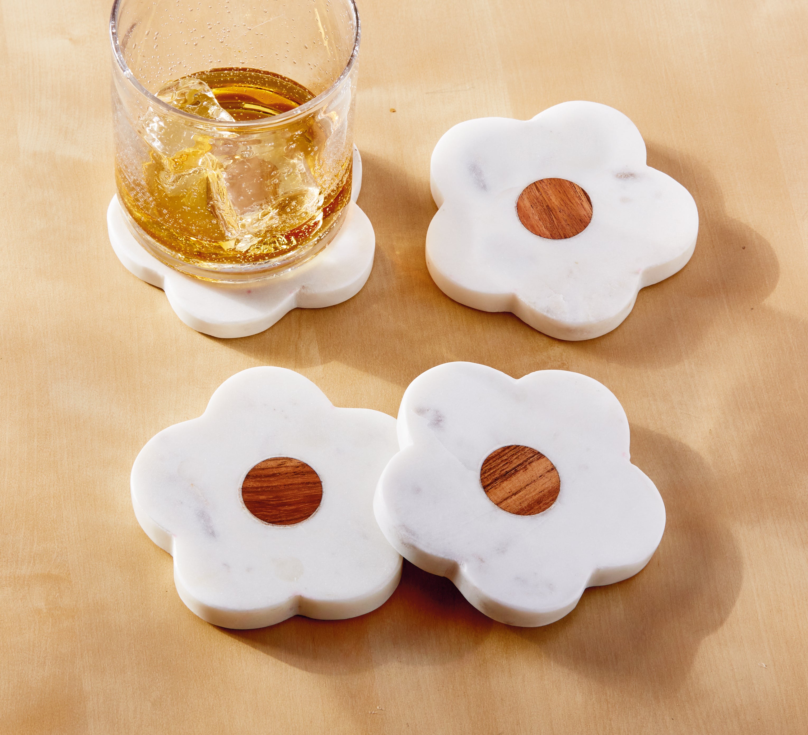 Marble & Wood Flower Coaster Set Of 4