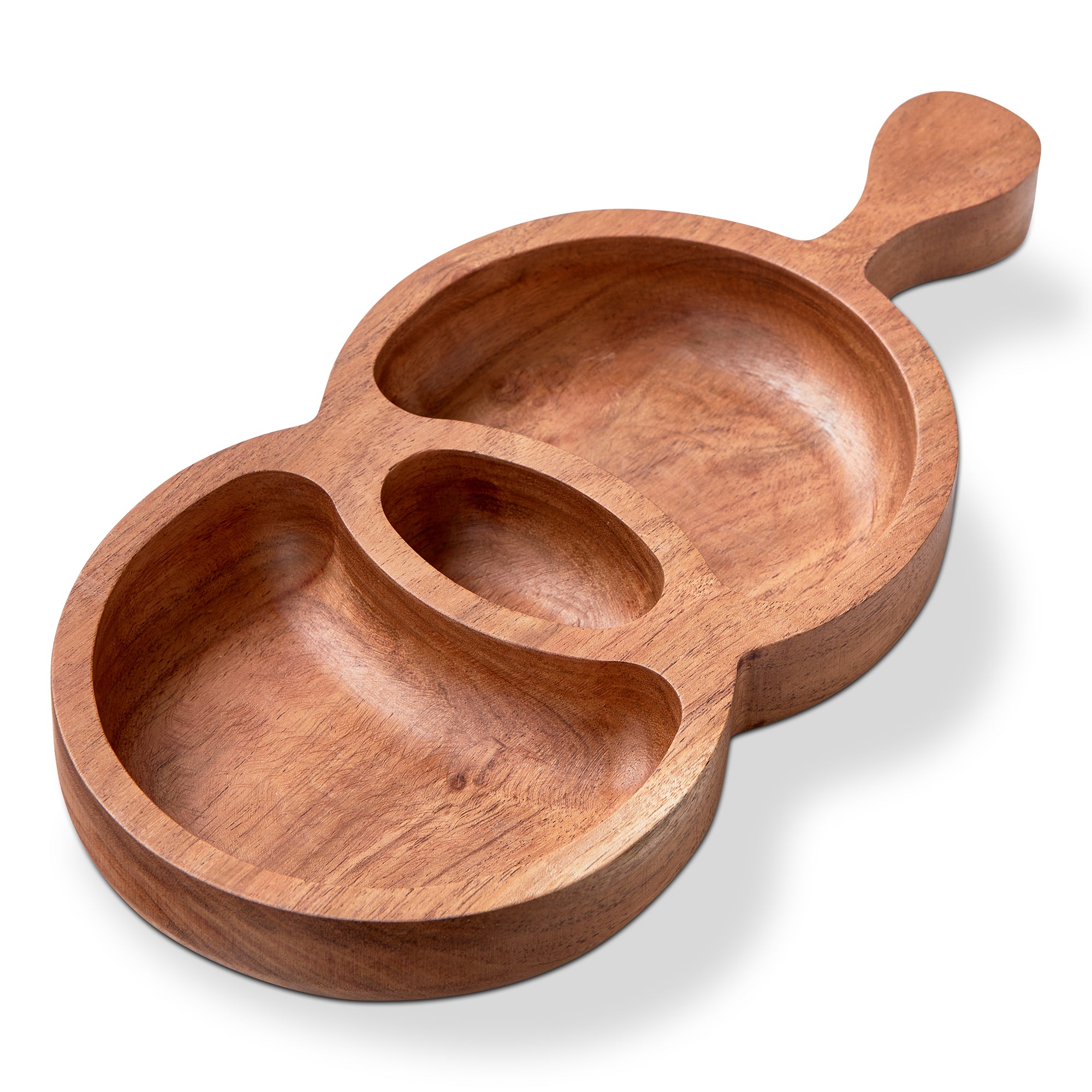 Great for entertaining! This hand-crafted, food-safe acacia wood server features three compartments, perfect for nuts, berries, and other snacks. Hand wash and oil to maintain.