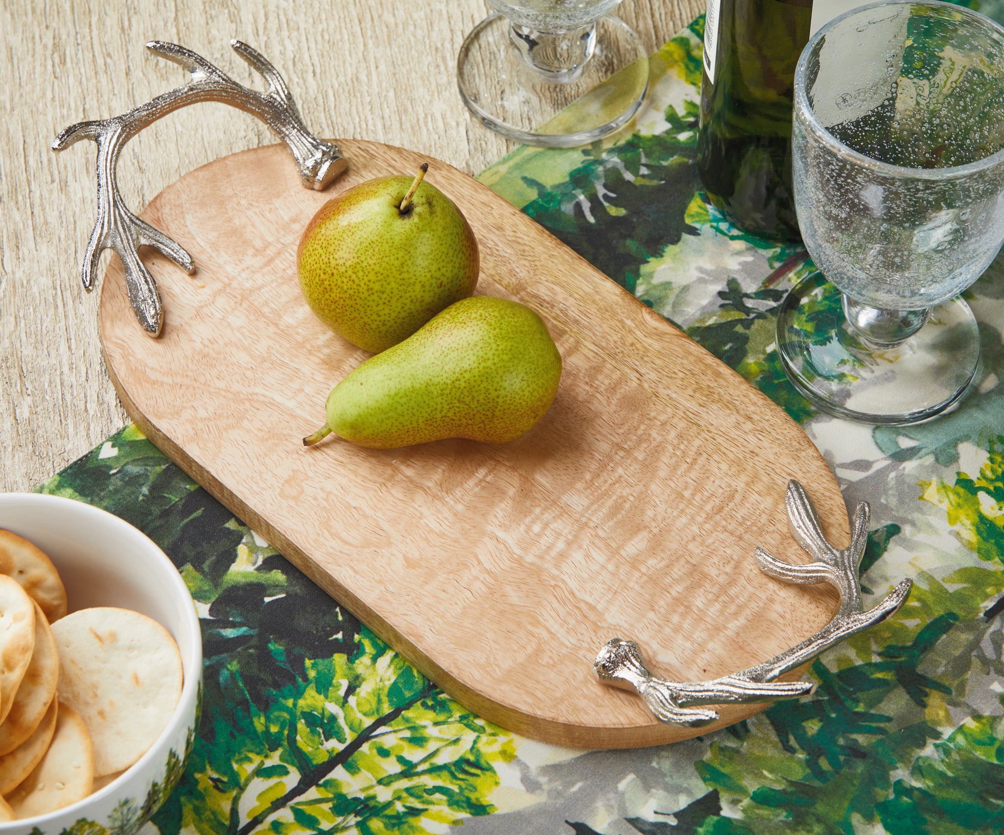Handcrafted mango wood and aluminum antler board designed with natural texture and warm seasonal detail. This elevated serving piece adds rustic holiday charm to charcuterie spreads, kitchen islands, and lodge inspired displays. Hand painted details add warmth while its versatile design makes styling simple. Sized for layered displays and pairs beautifully with seasonal greenery and décor.