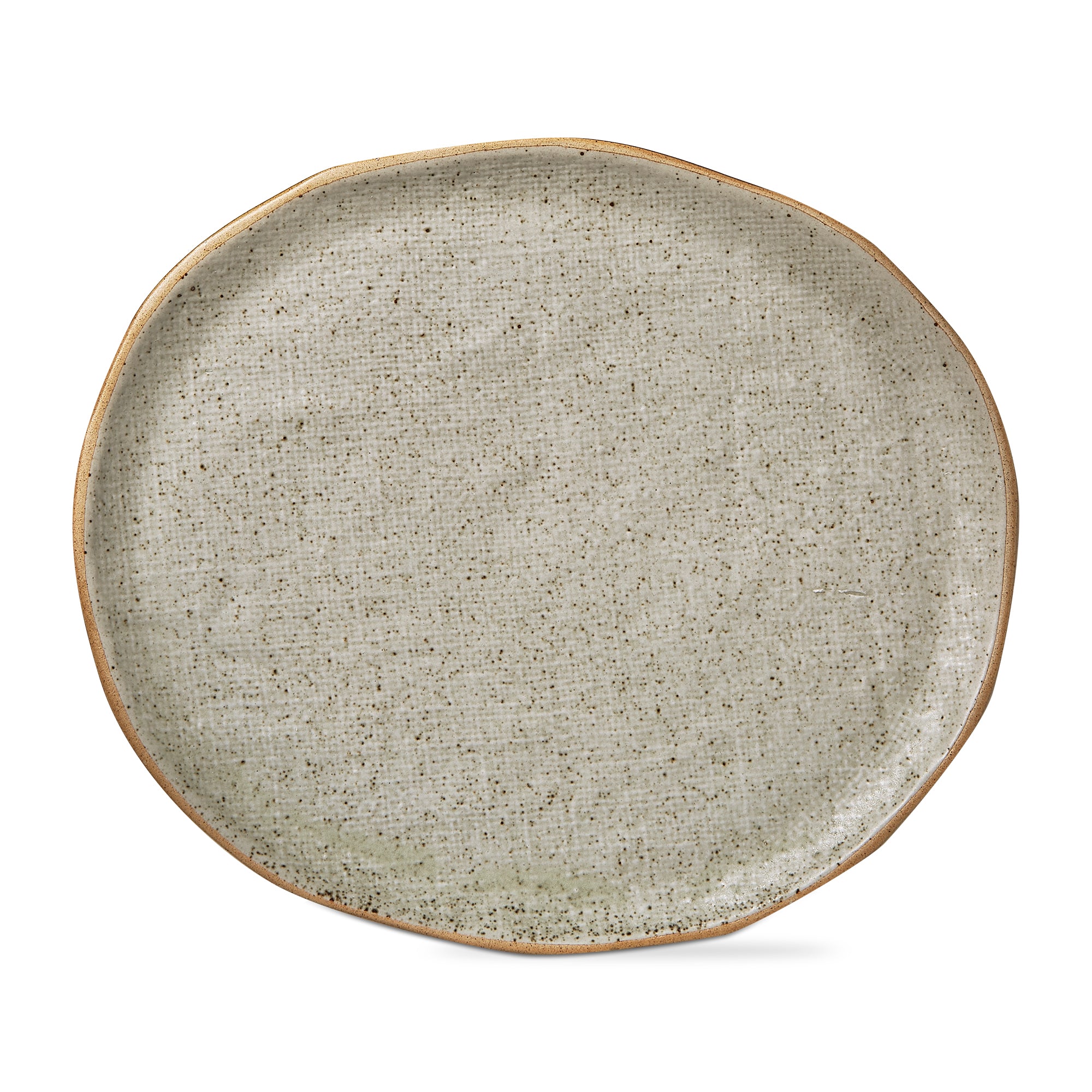 A platter that is a work of art! features gorgeous porcelain construction, speckle design, and matte reactive glaze finish. exposed clay rim. slight variations in color are to be expected—each piece is one-of-a-kind, no two pieces will be exactly alike. subtle textured surface. mix and match with a range of reactive glaze selections from tag.