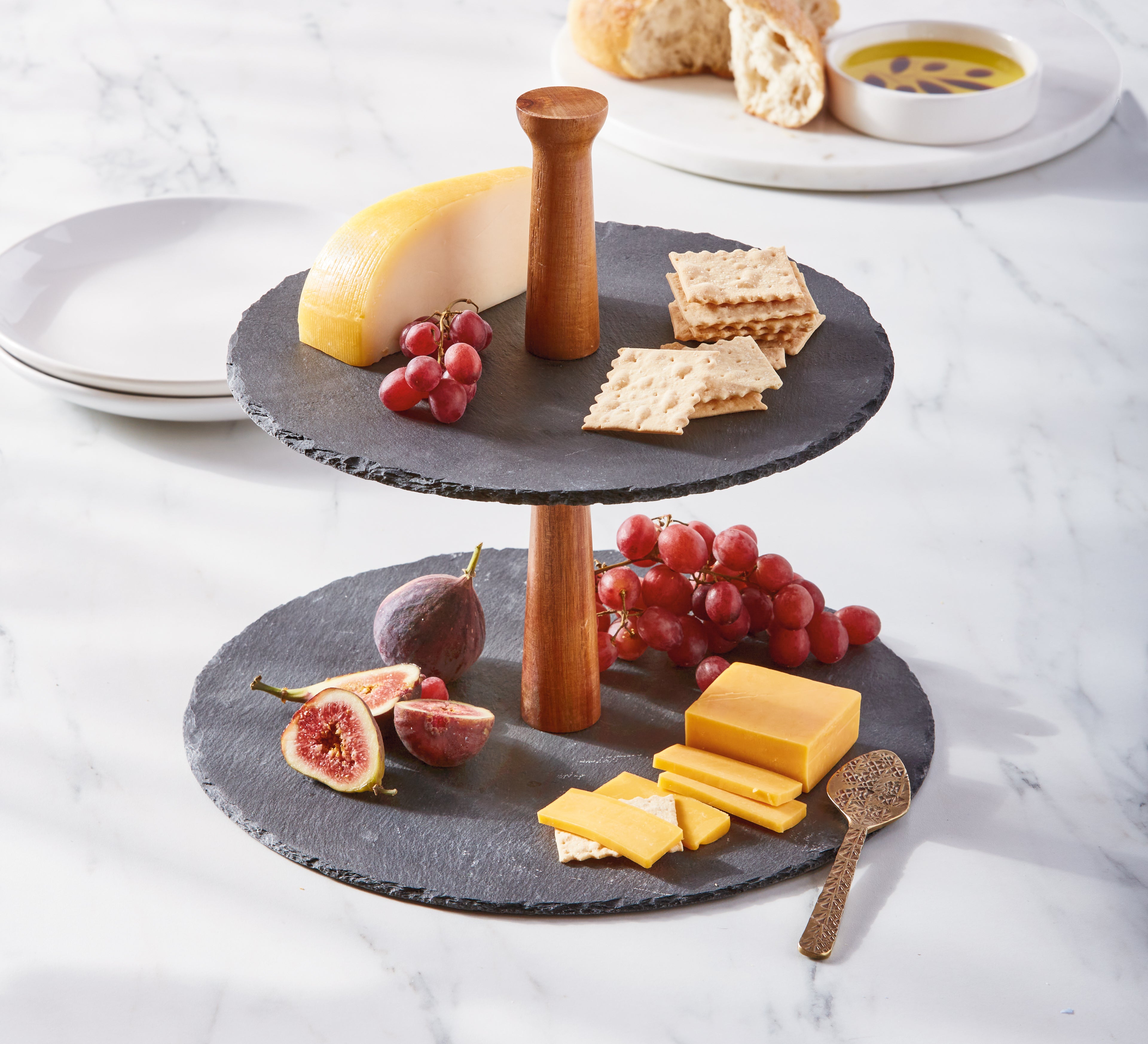 Create an eye-catching display with this two-tier server featuring black slate platters and an acacia wood stand. Assembly required. Hand wash recommended