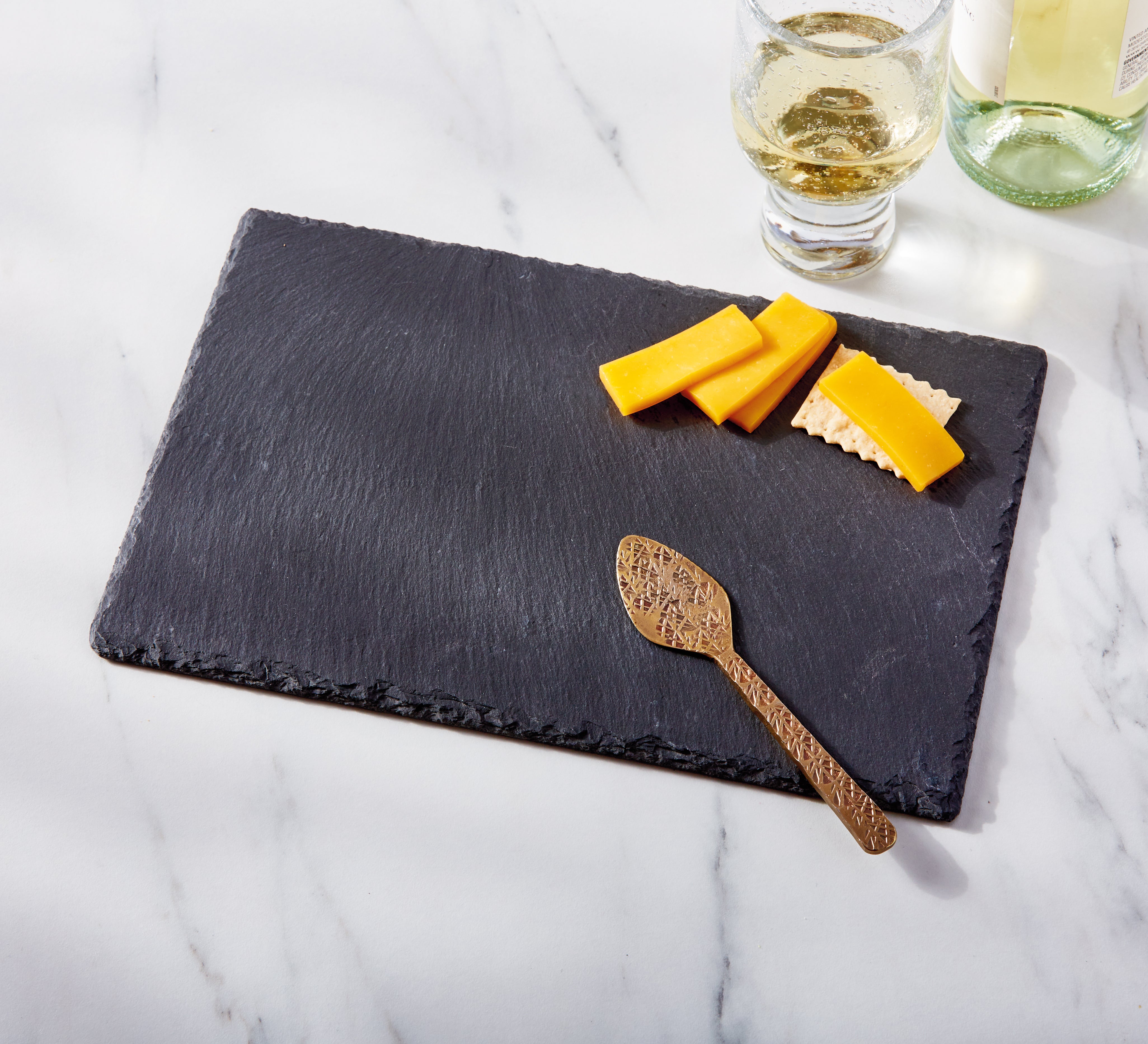 Present your appetizers or culinary creations on this elegant rectangular black slate serving board. Hand wash recommended.