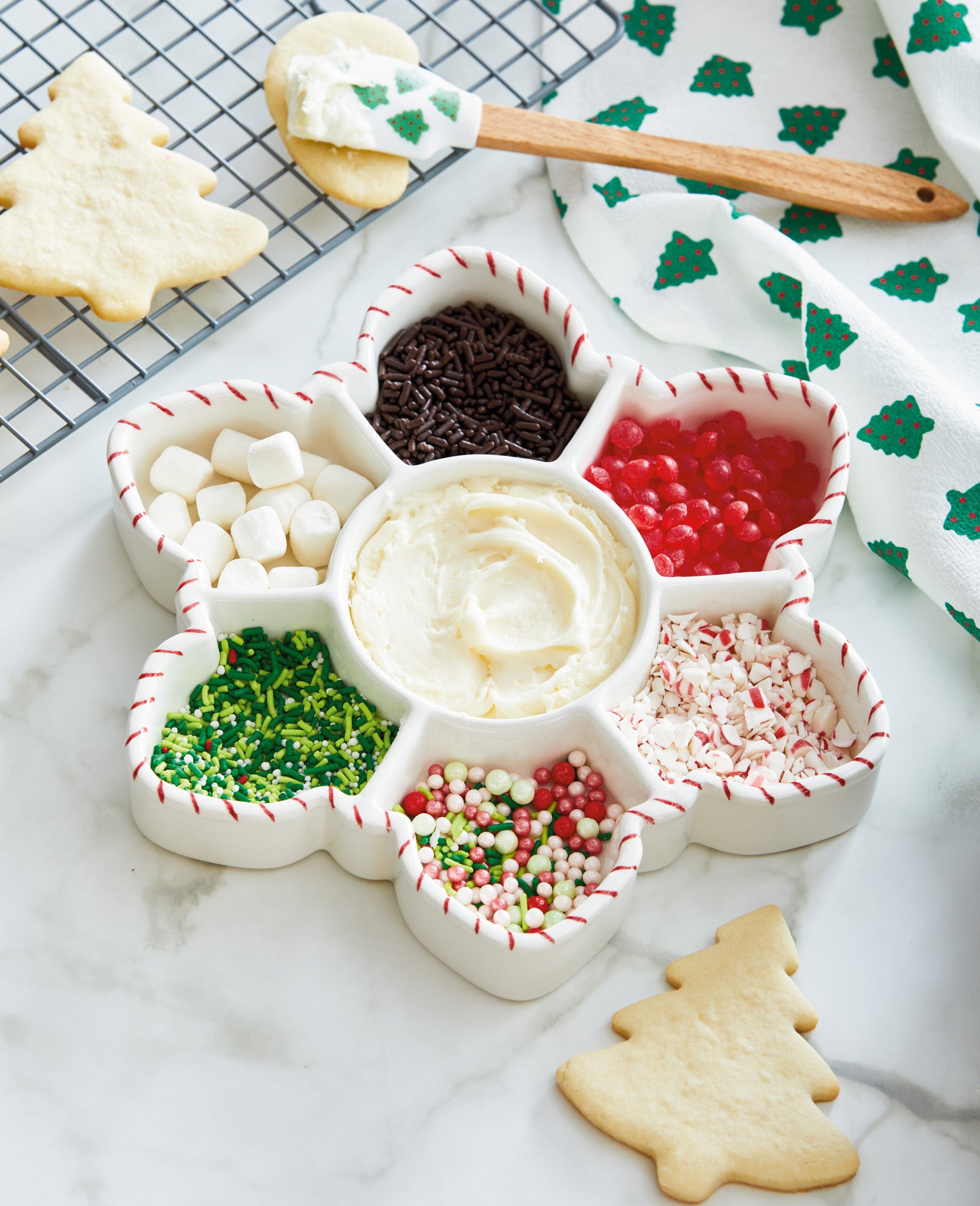 This 7 part server featuring sculpted pieces arranged like a festive holiday treat tray. Perfect for candies, nuts, toppings, and small bites at seasonal parties or gift exchanges. Hand painted details add warmth while its versatile design makes styling simple. Sized for layered displays and pairs beautifully with seasonal greenery and décor.