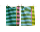 The perfect beachy/lake dishtowels! Set of two cotton dishtowels with a satin weave stripe and pink rick rack trim. Includes hang loops. Instantly elevate your kitchen!