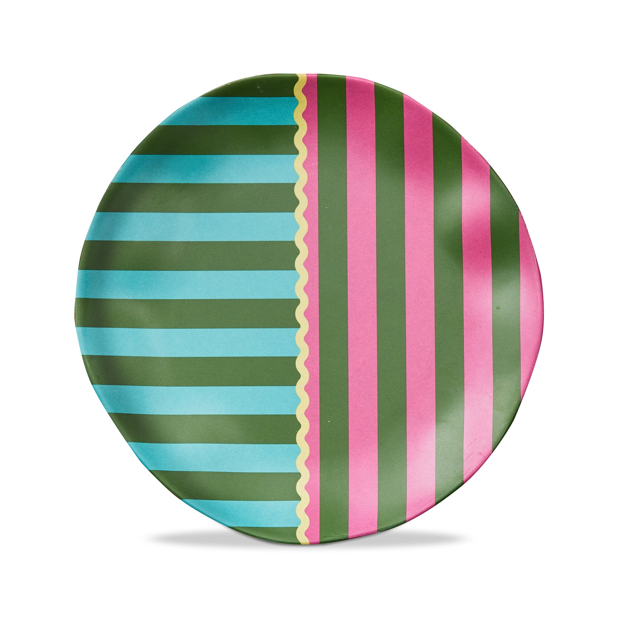 Serve appetizers in style with this BPA-free and shatterproof melamine plate. Featuring organic shapes and a matte finish with green, blue, and pink stripes, it offers the look of ceramic with added durability.
