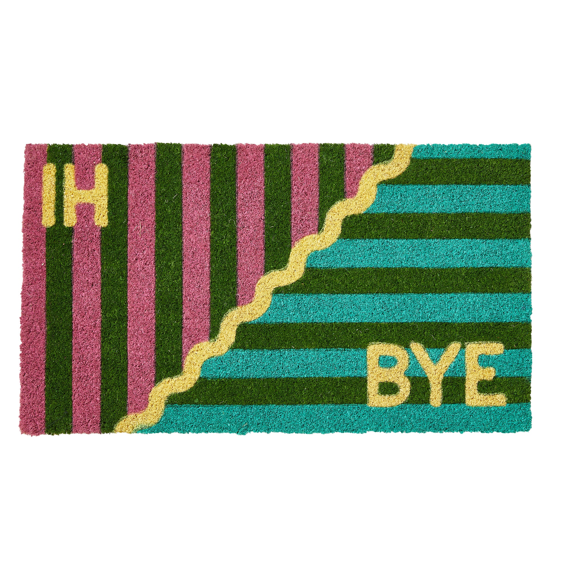 This tag original striped coir doormat with a non-slip PVC backing features "hi" on one side and "bye" on the other.