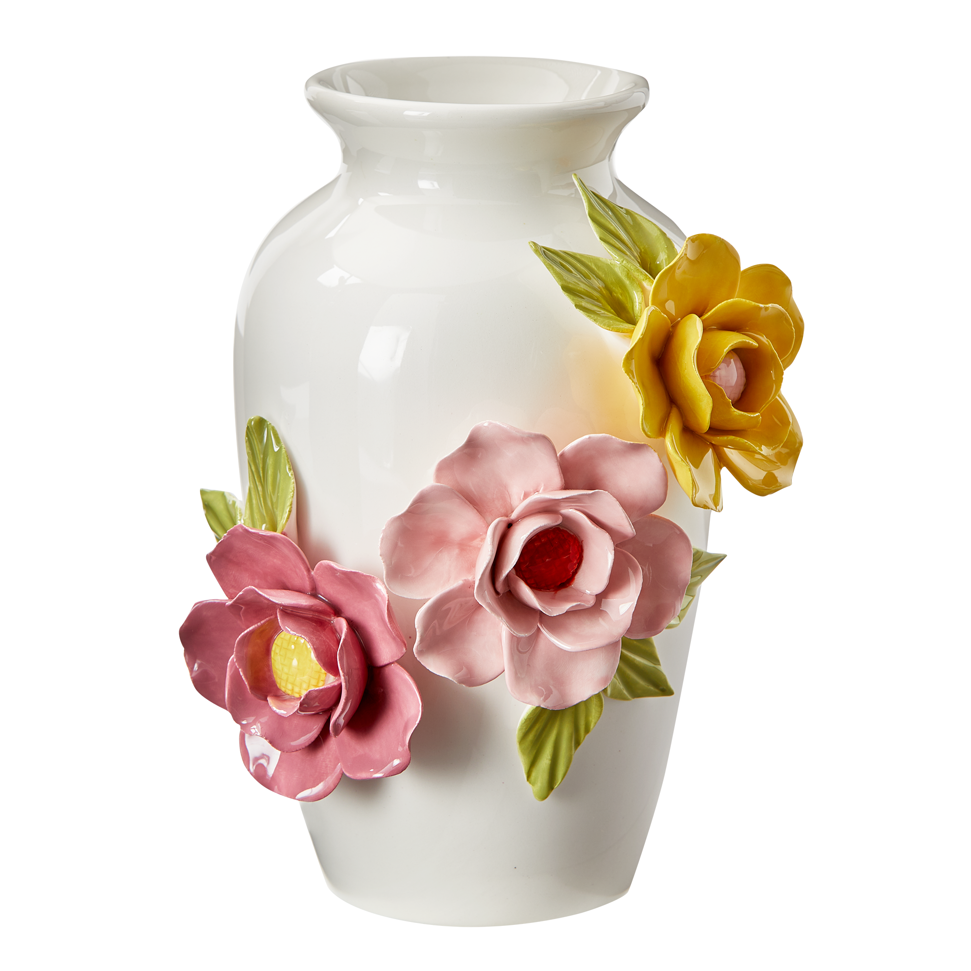 This beautifully handcrafted ceramic vase features delicate hand-crafted pink and yellow flowers, making it a stunning centerpiece.