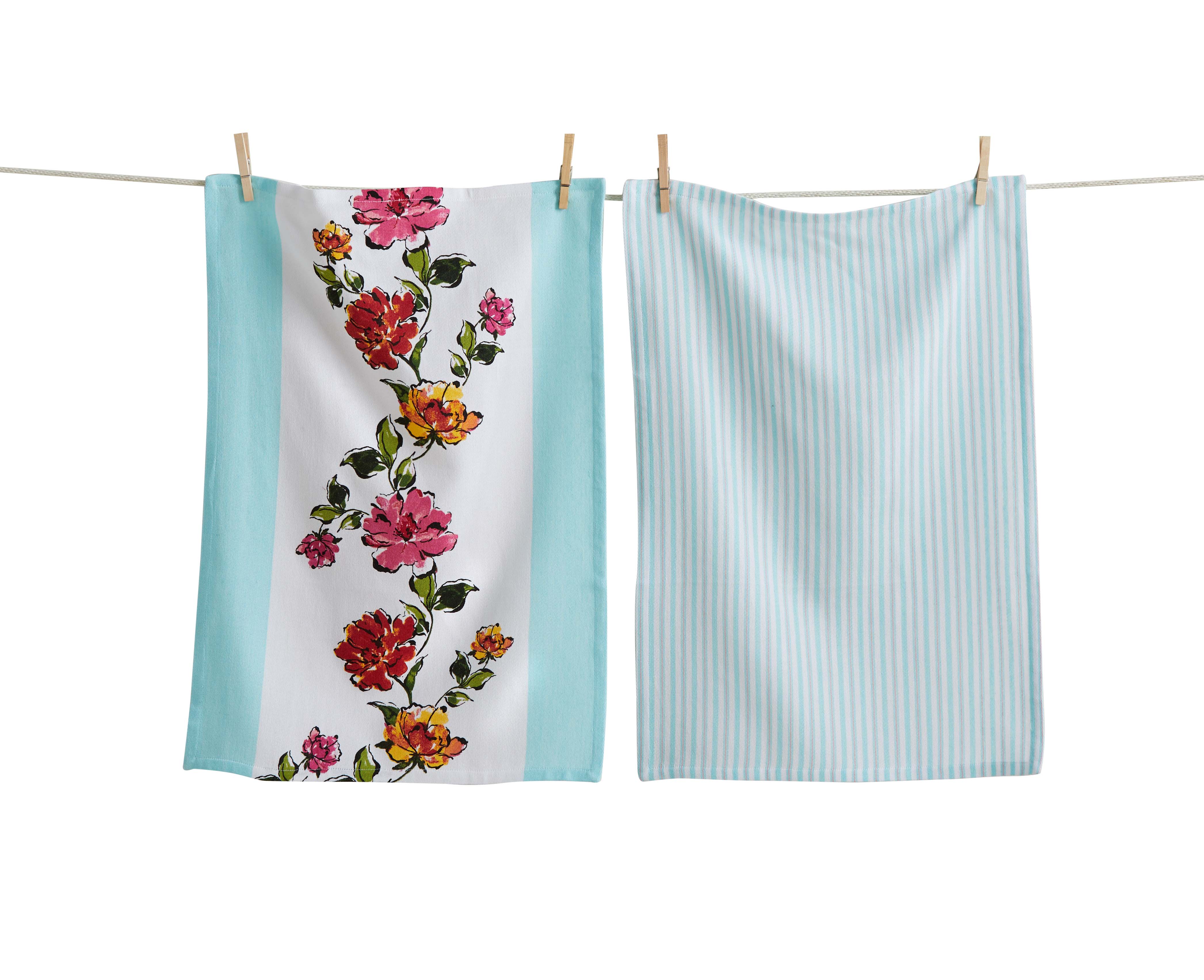 Set of two cotton dishtowels: one with a light blue woven stripe, and one with a woven stripe and pink floral print. Includes hang loops.