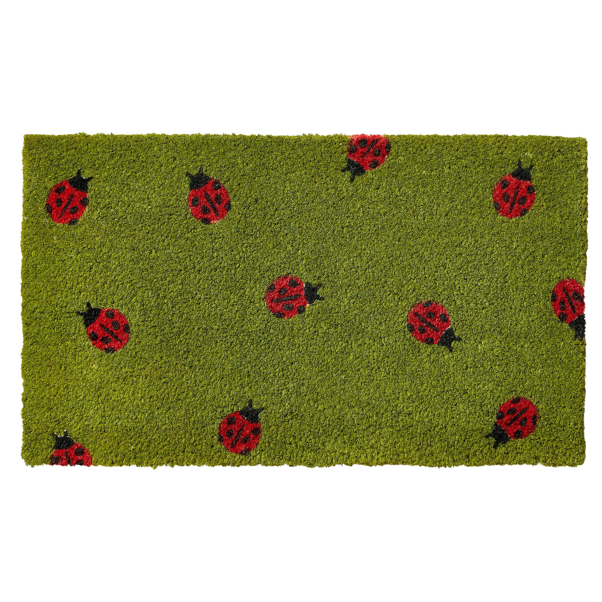 This tag original natural coir doormat features hand-painted ladybugs on a green background made from hand-spun coir.
