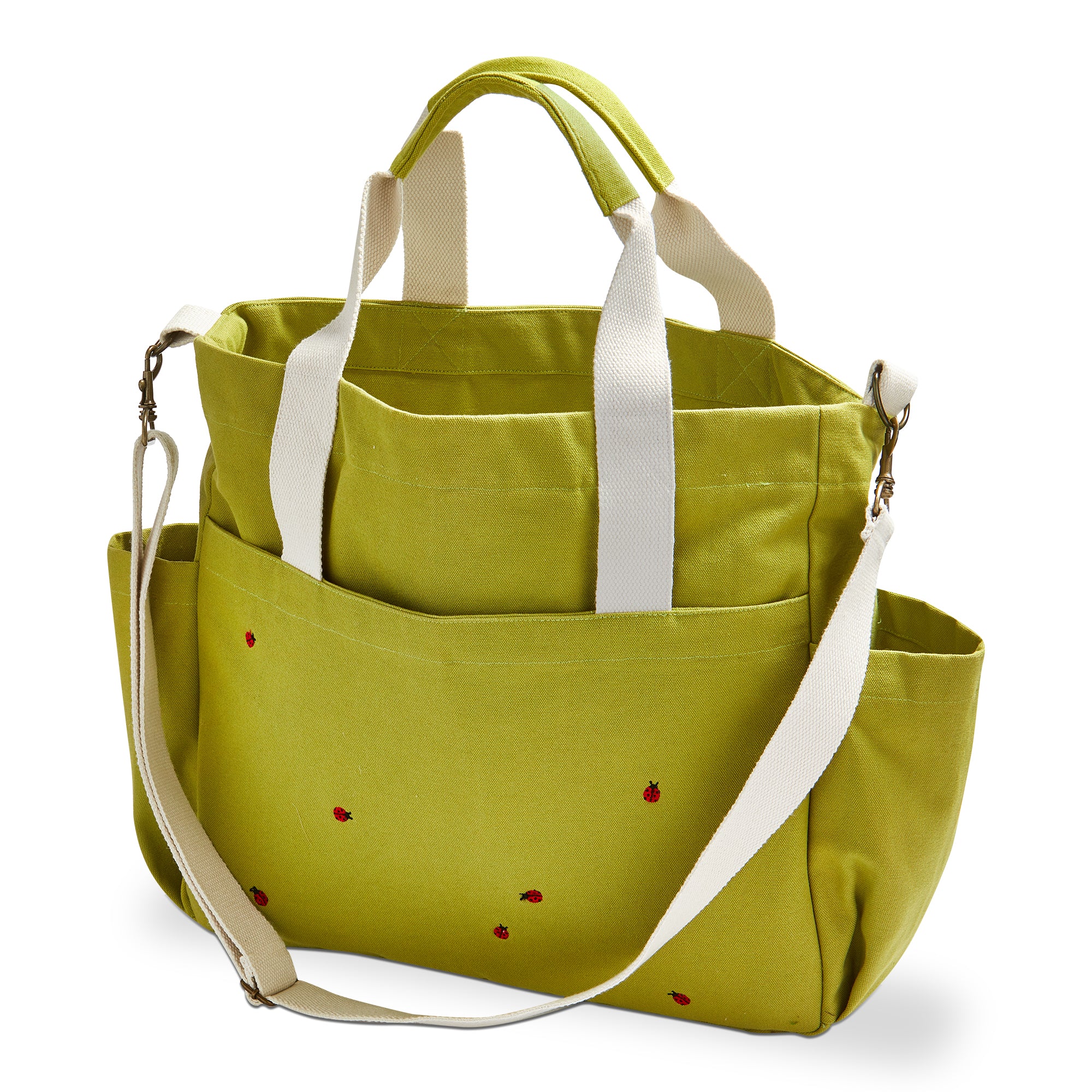 The perfect garden tote! Made from 100% cotton (exclusive of decoration) and embroidered with little ladybugs. Features 1 interior pocket, 3 exterior pockets, a removable adjustable strap, reinforced handles, and a snap closure.