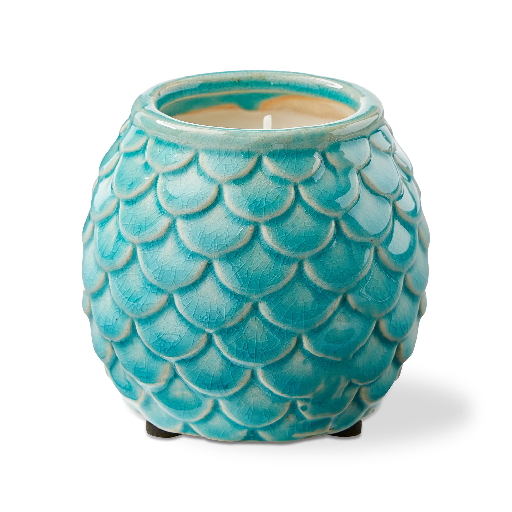 This hand-poured teal terracotta candle is scented with citronella and has a cotton wick, offering a 12-hour burn time. Keep wick trimmed. For outdoor use only.