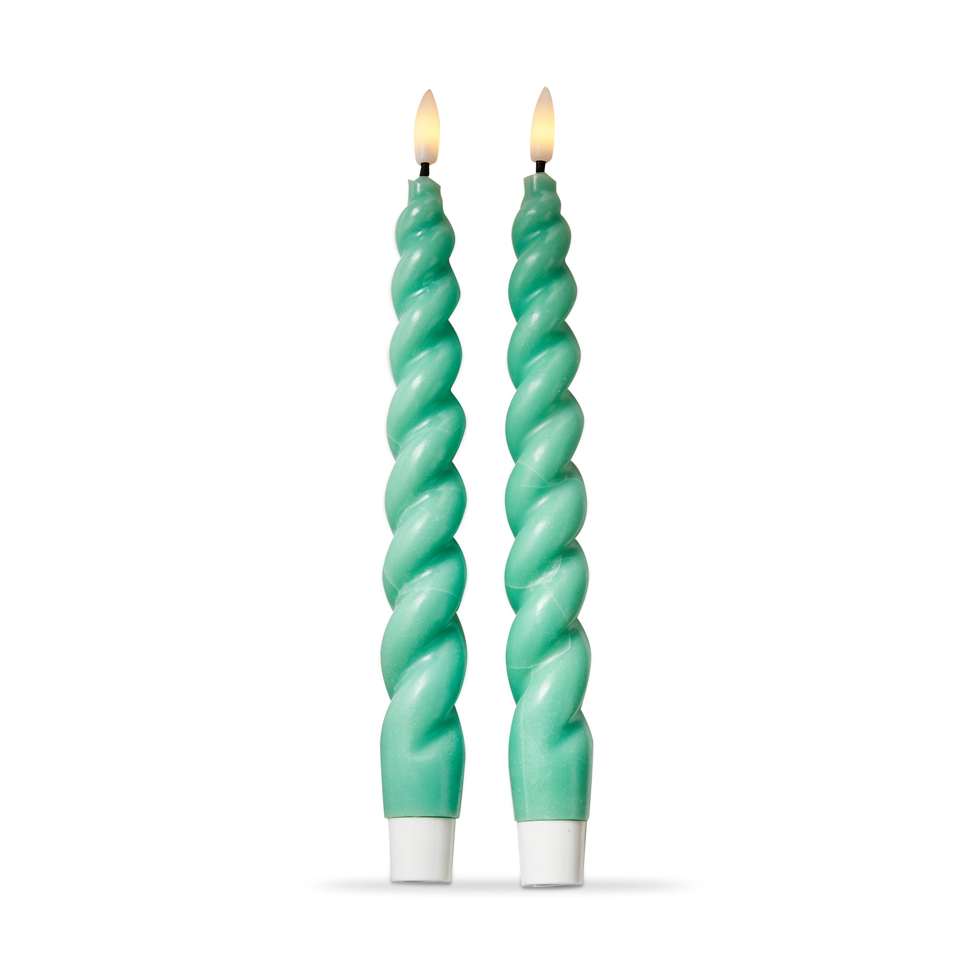 This retail-ready packaged set includes two green flameless LED wax spiral taper candles with an on/off/5-hour timer. Each requires 2 AAA batteries (not included) and is for indoor use only. Wipe clean with a damp cloth.