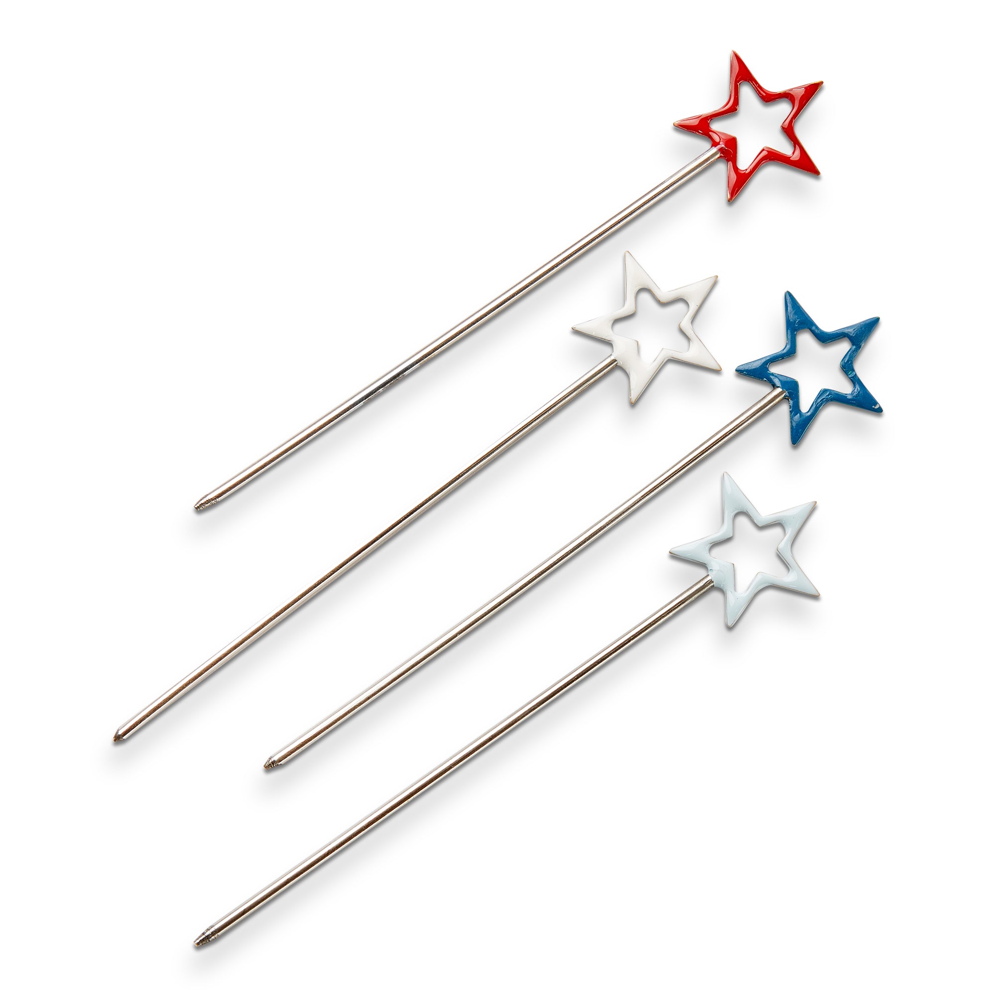 Add a festive touch to your 4th of July BBQs with this set of four metal cocktail and food picks featuring enamel star decorations in red, white, and blue. Hand wash recommended.
