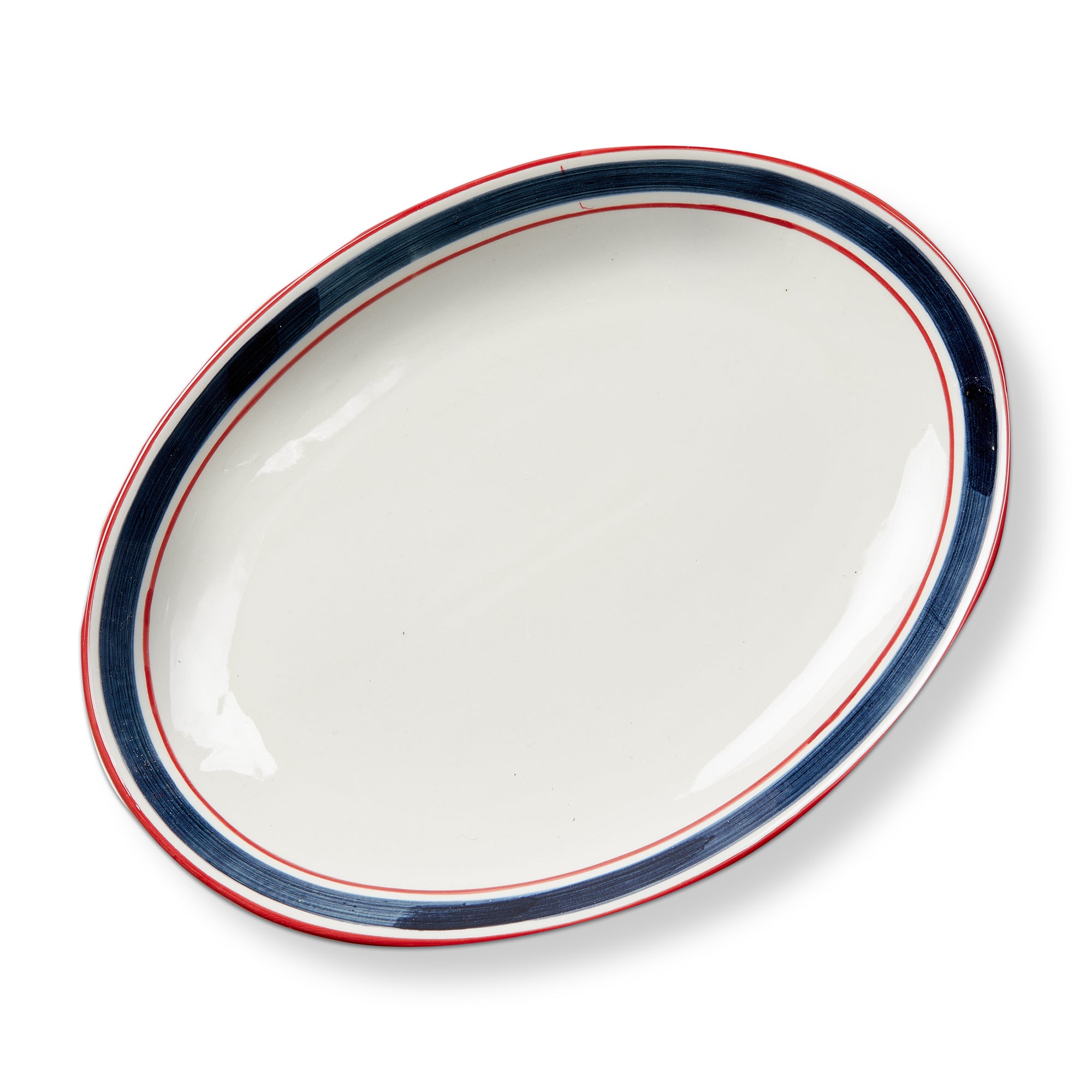 Perfect for 4th of July gatherings. This stoneware platter features hand-painted blue and red stripes on the border, adding a festive touch to your summer table.