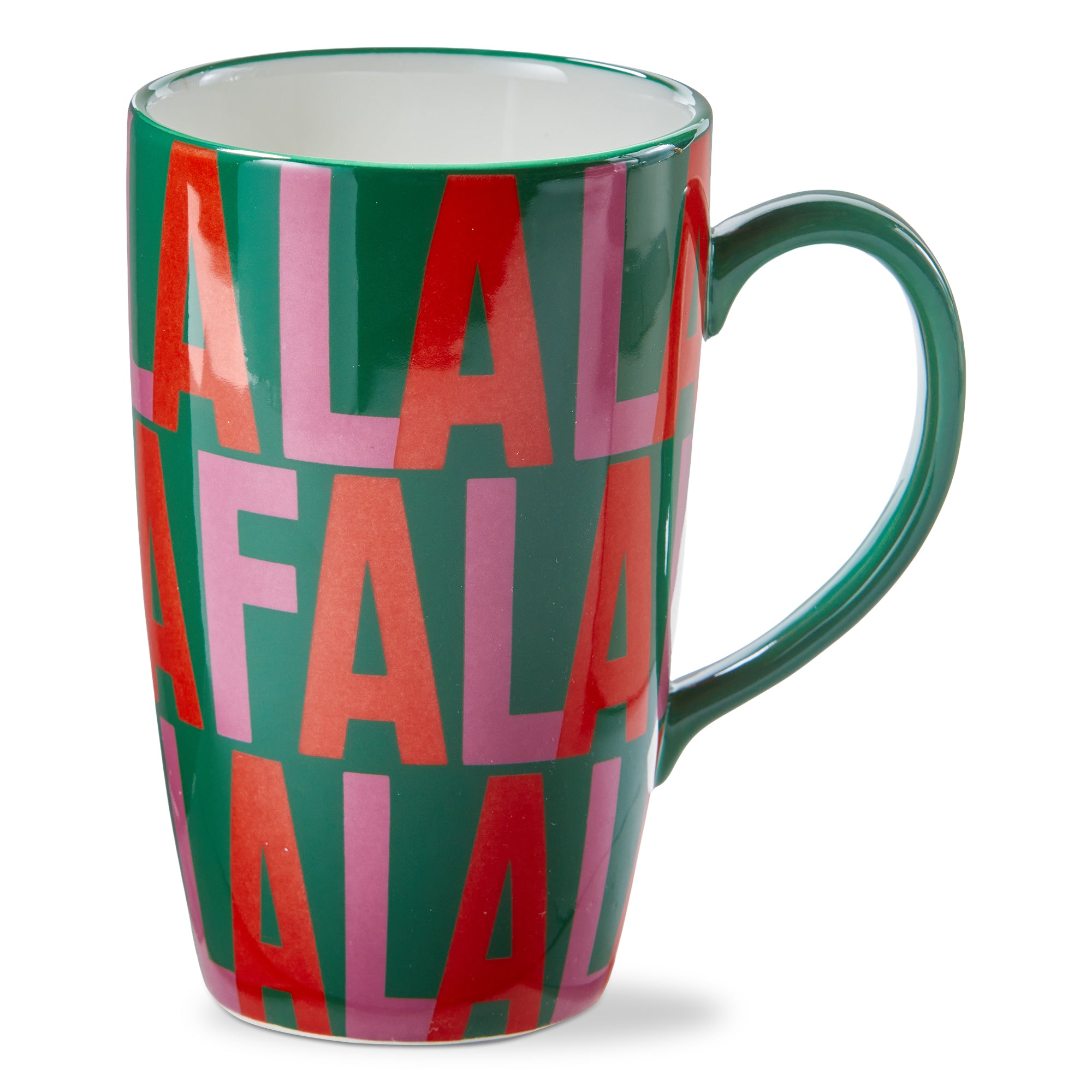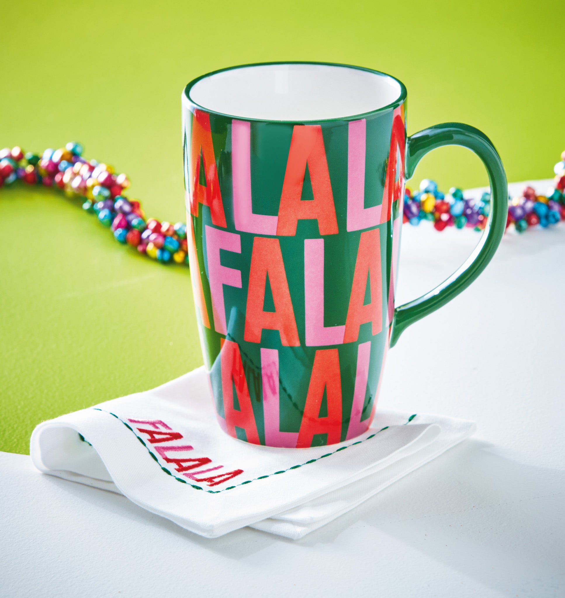 Bold Falala mug wrapped in vibrant holiday typography. A playful and modern addition to Christmas drinkware collections and gifting moments. Hand painted details add warmth while its versatile design makes styling simple. Sized for layered displays and pairs beautifully with seasonal greenery and décor. View all items in Groovy Christmas.