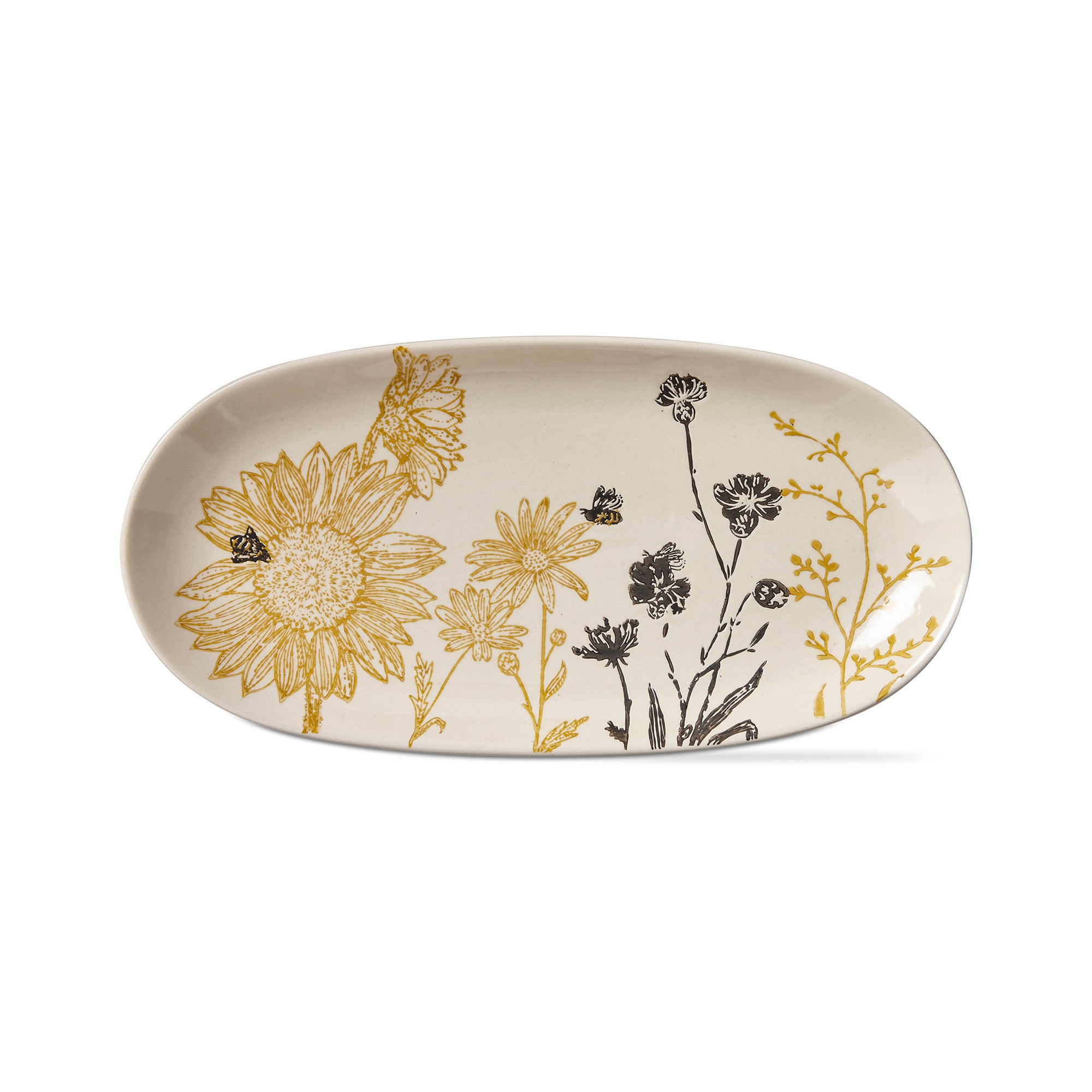 It's all in the details! Serve up appetizers and hors d'oeuvres alongside this beautiful bee design. Both functional as decorative, this platter features stoneware construction and wax resist with hand paint, hand sponge stamp floral design.