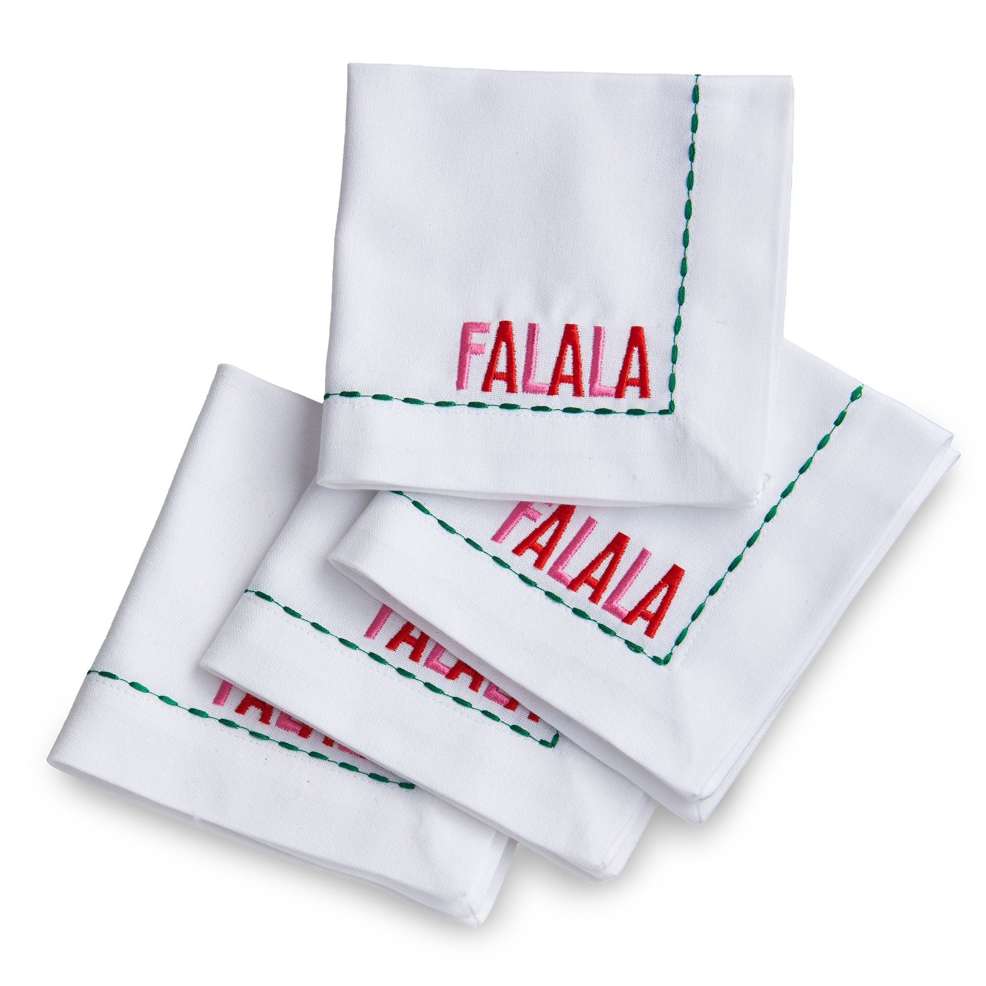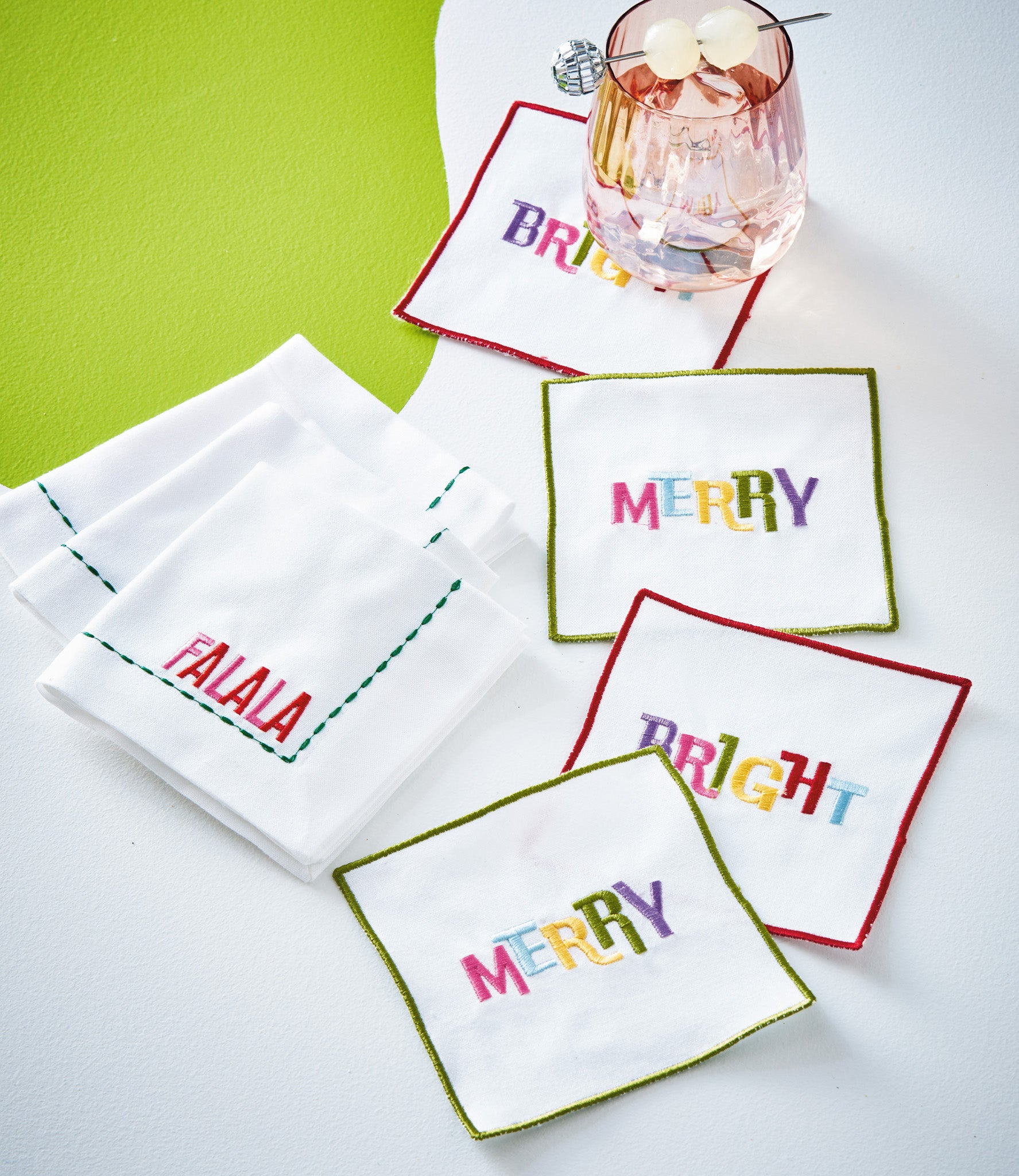 Falala cocktail napkins bring embroidered lettering and contrast stitching to small napkins that dress bar carts and trays. Hand painted details add warmth while its versatile design makes styling simple. Sized for layered displays and pairs beautifully with seasonal greenery and décor. View all items in Groovy Christmas.