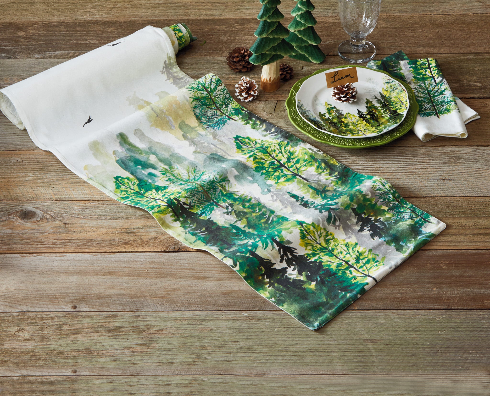 Northern Forest trees runner with digitally printed evergreens on soft cotton. Mitered corners and a generous length make it ideal for long holiday tables. Hand painted details add warmth while its versatile design makes styling simple. Sized for layered displays and pairs beautifully with seasonal greenery and décor. View all items in Northern Forest.