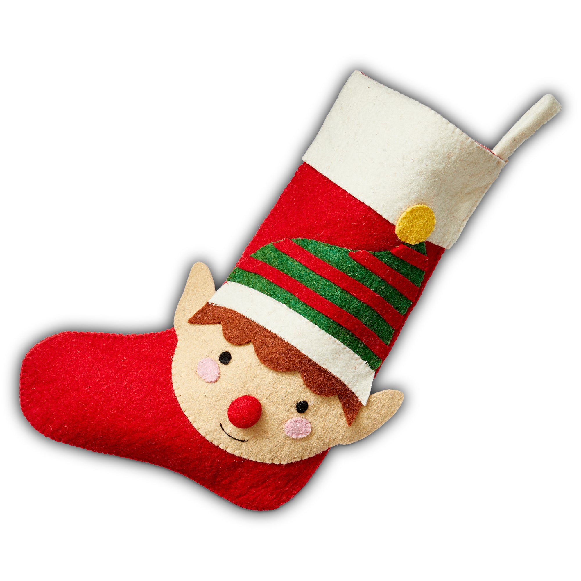 Fun elf red felt stocking with bright contrast stitching that brings nostalgic cheer to mantels, railings, and holiday displays. Hand painted details add warmth while its versatile design makes styling simple. Sized for layered displays and pairs beautifully with seasonal greenery and décor. View all items in Holiday Cheer.
