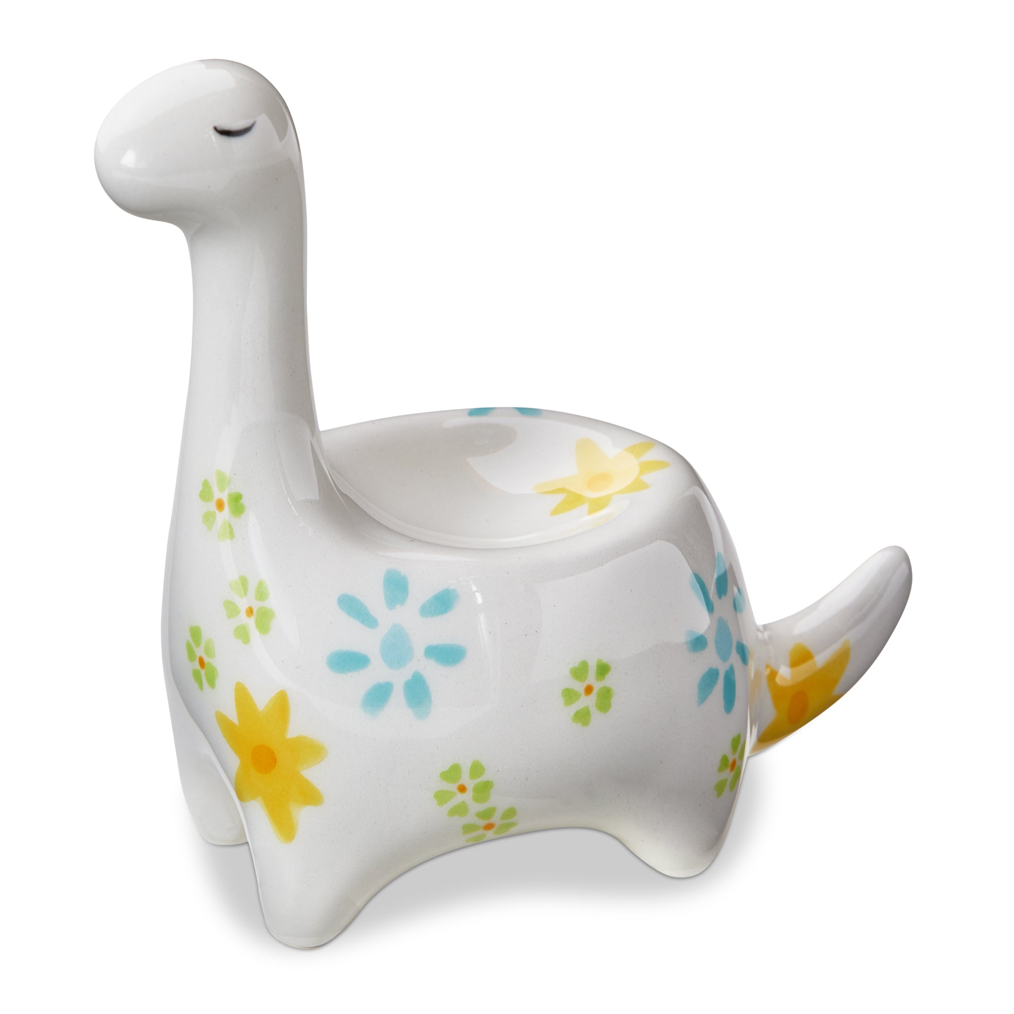 The Ceramic Dinosaur Ring Holder features floral accents in yellow and green. A whimsical way to store rings or add a playful touch to a desk or dresser. View all items in Trinket Trove.