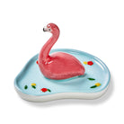 The Ceramic Flamingo Ring Holder features a pink flamingo with painted flowers on a blue-rimmed tray. Perfect for keeping rings safe by the sink or as a decorative accent in a bedroom or bath. View all items in Trinket Trove.