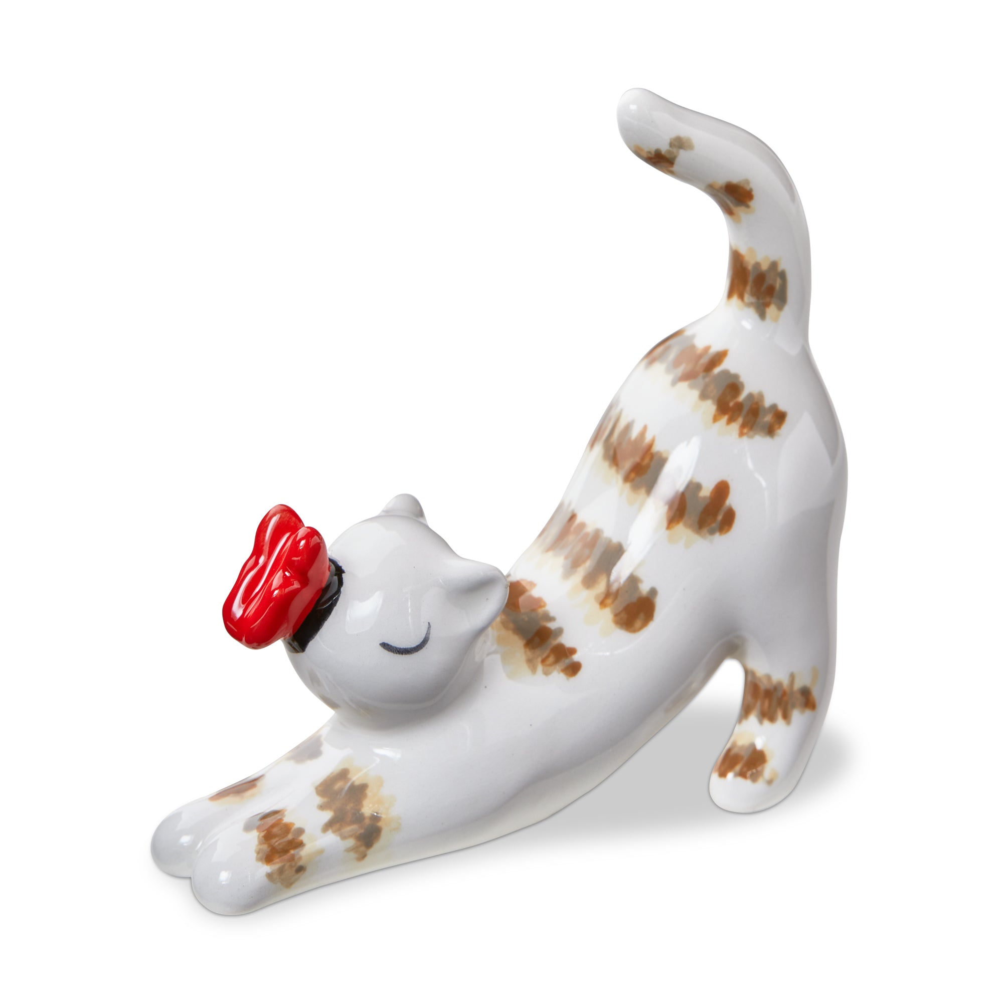 The Ceramic Stretching Cat Ring Holder has a red bow and gold-striped tail. Use it to keep rings safe or display as a charming figurine for cat lovers. View all items in Trinket Trove.
