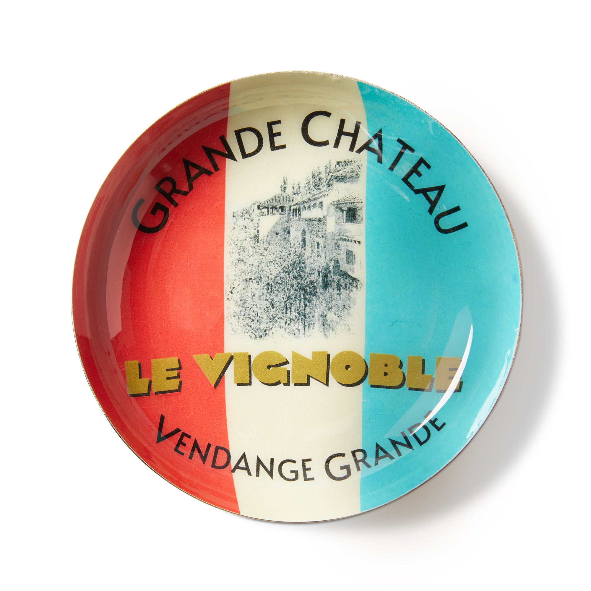 The Multicolor Metal Trinket Dish features a vibrant vineyard and wine label design. Great for a bar cart accessory, a coaster for a wine bottle, or as a decorative wall plate. View all items in Trinket Trove.