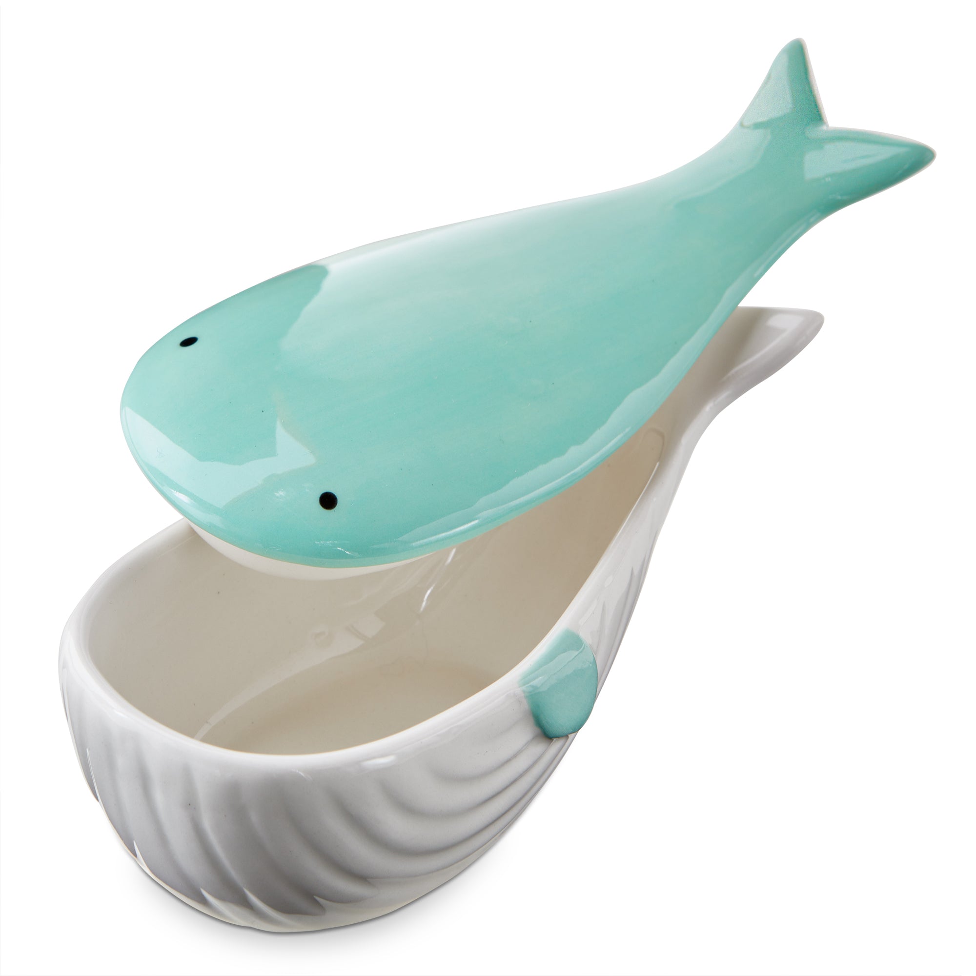 The Whale Lidded Trinket Box is a glossy aqua and white ceramic keepsake shaped like a smiling whale. Tuck in rings, ear buds, hair ties, or tiny mementos and display it on a nightstand, bath shelf, or coastal themed tray. View all items in Trinket Trove.