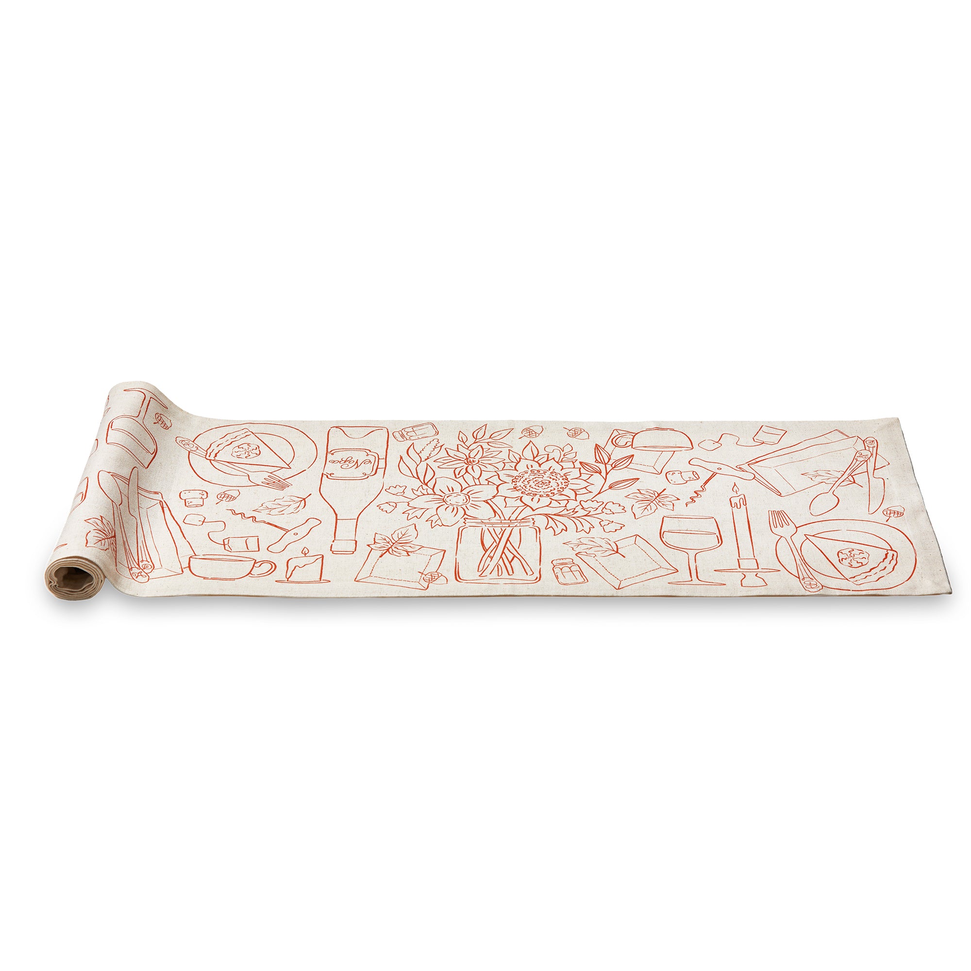 Friendsgiving runner in warm orange tones with screen printed artwork and linen blend feel. Perfect for fall dinners, Friendsgiving, and Thanksgiving gatherings. Hand painted details add warmth while its versatile design makes styling simple. Sized for layered displays and pairs beautifully with seasonal greenery and décor.