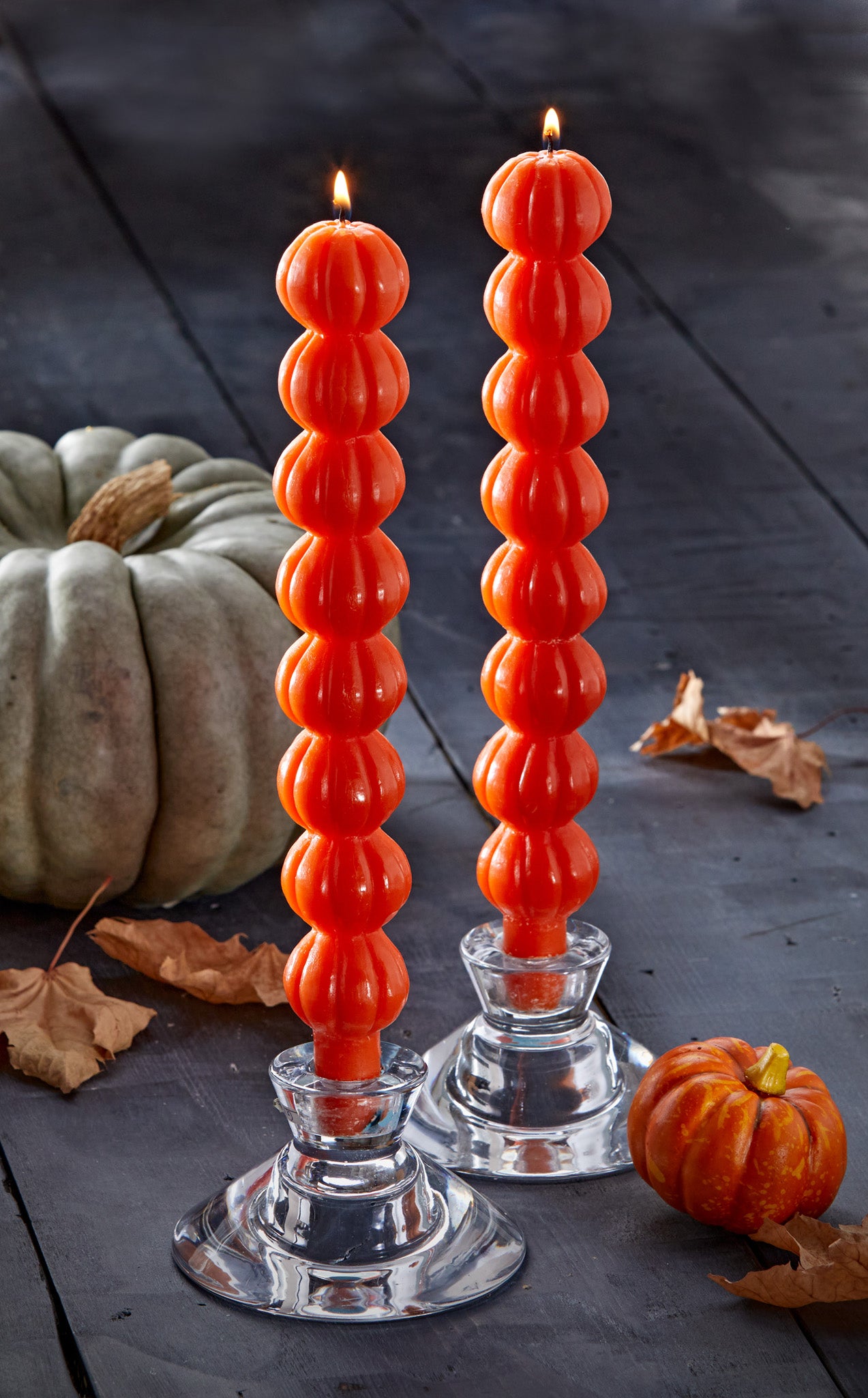 Embrace the spirit of autumn with these festive pumpkin taper candles. Each candle features a stack of pumpkins, perfect for Halloween or Thanksgiving. These candles will add a touch of warmth and coziness to your home during the fall season.