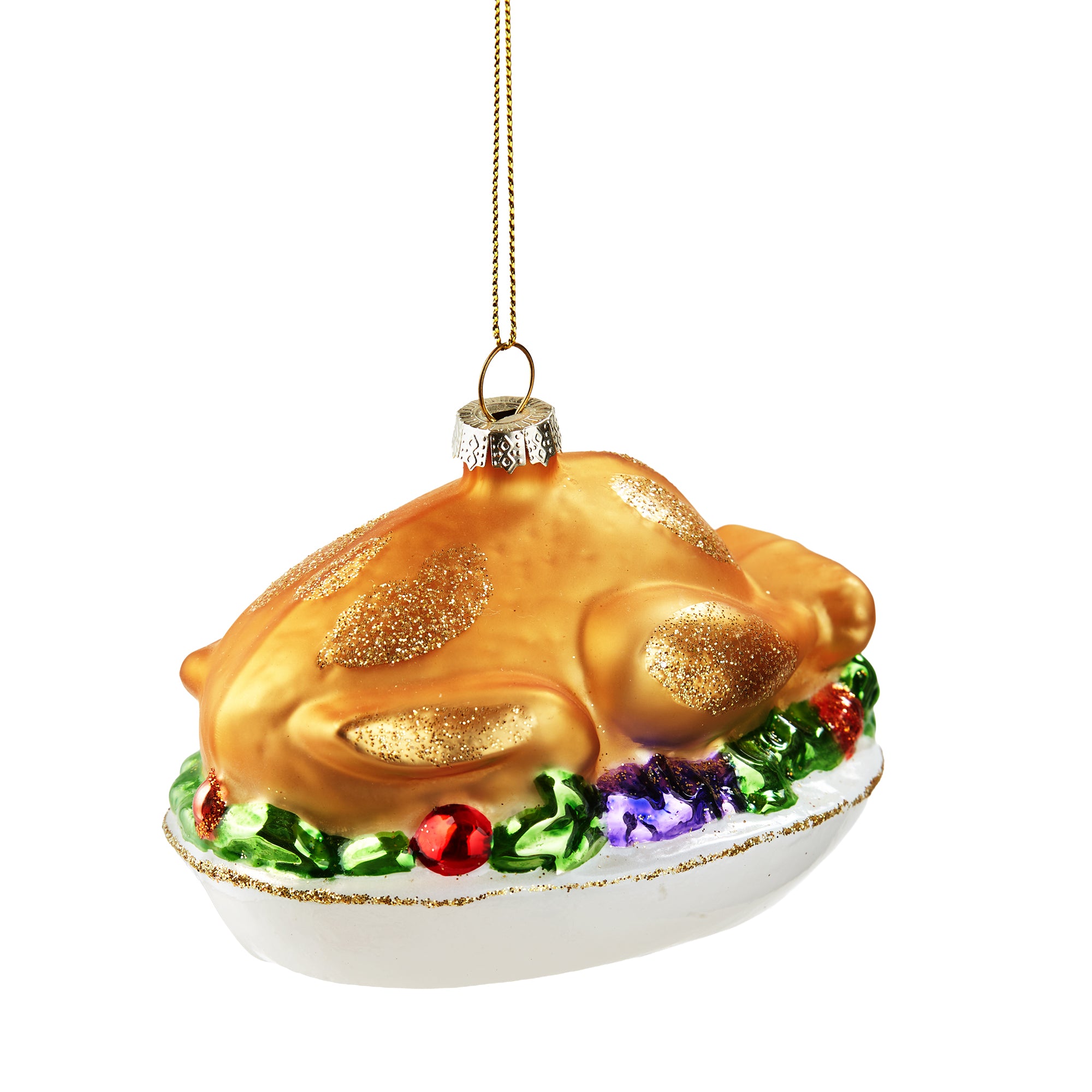 Turkey ornament features a plump holiday bird with rich color perfect for Thanksgiving trees and for tying onto napkins or hostess gifts. Hand painted details add warmth while its versatile design makes styling simple. Sized for layered displays and pairs beautifully with seasonal greenery and décor.