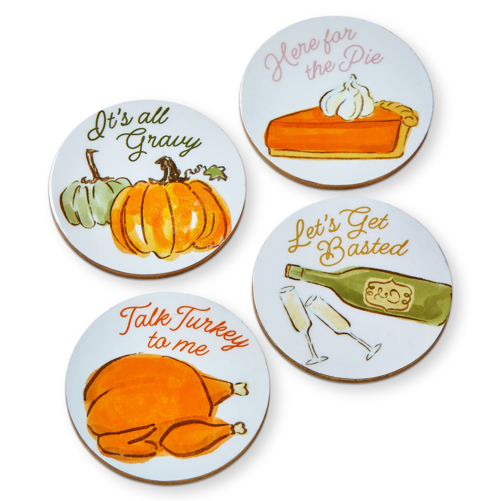 Set of four enamel decorated coasters featuring playful Turkey and Toast artwork. A fun addition to fall gatherings and Friendsgiving tables. Hand painted details add warmth while its versatile design makes styling simple. Sized for layered displays and pairs beautifully with seasonal greenery and décor.