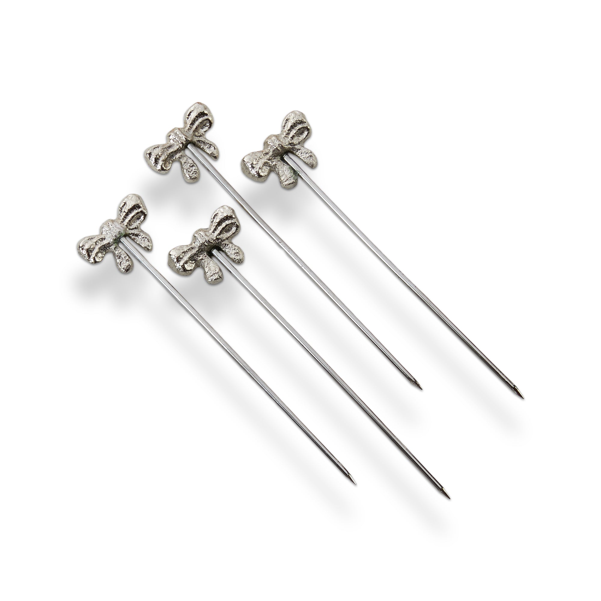 Set of four silver bow cocktail picks with sculpted decorative tops. A charming way to add sparkle to cocktails, garnishes, and holiday bar setups. Hand painted details add warmth while its versatile design makes styling simple. Sized for layered displays and pairs beautifully with seasonal greenery and décor. View all items in Winter Berries.