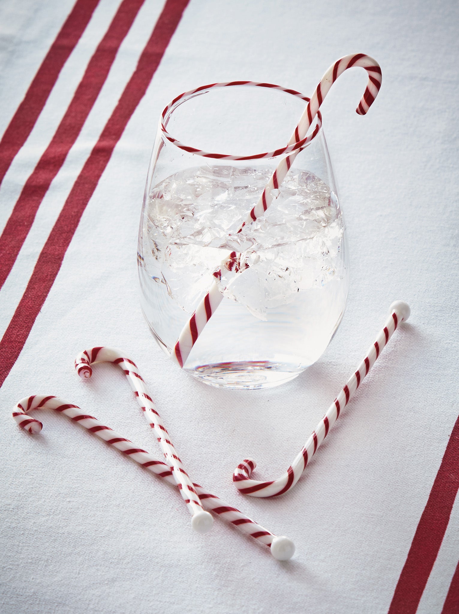 Set of candy cane swizzle sticks that sweeten holiday beverages with hand crafted glass detailing and cheerful red striping. Hand painted details add warmth while its versatile design makes styling simple. Sized for layered displays and pairs beautifully with seasonal greenery and décor.