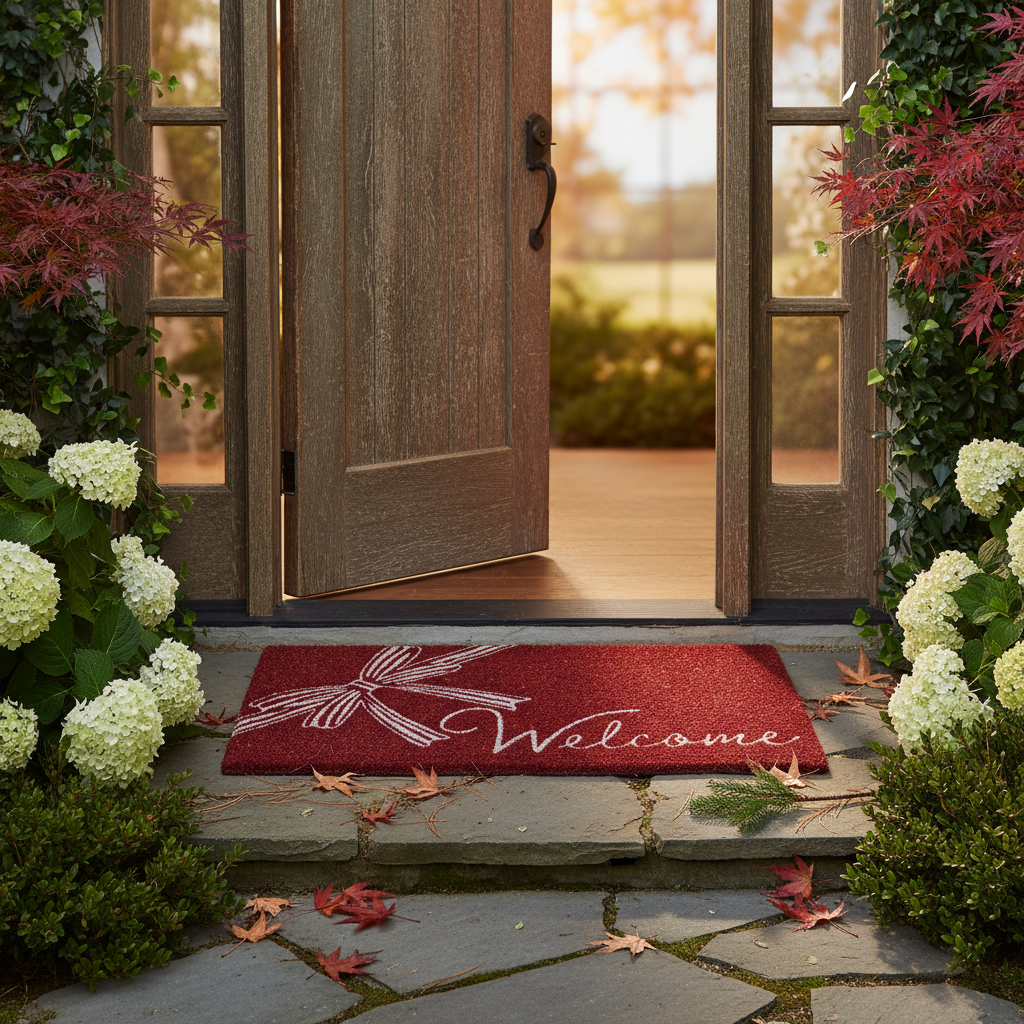 Cheerful coir doormat featuring a hand painted welcome bow for festive entryways. Hand spun coir fibers offer durability while the colorful artwork adds charm to front doors. Perfect for pairing with holiday garlands and wreaths. Hand painted details add warmth while its versatile design makes styling simple. Sized for layered displays and pairs beautifully with seasonal greenery and décor. View all items in Winter Berries.
