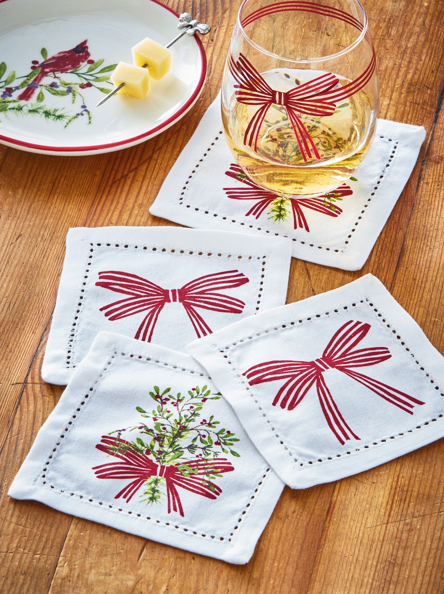Winter berries cotton coaster set that brings everyday protection and festive red berry detail to winter coffee tables. Hand painted details add warmth while its versatile design makes styling simple. Sized for layered displays and pairs beautifully with seasonal greenery and décor. View all items in Winter Berries.