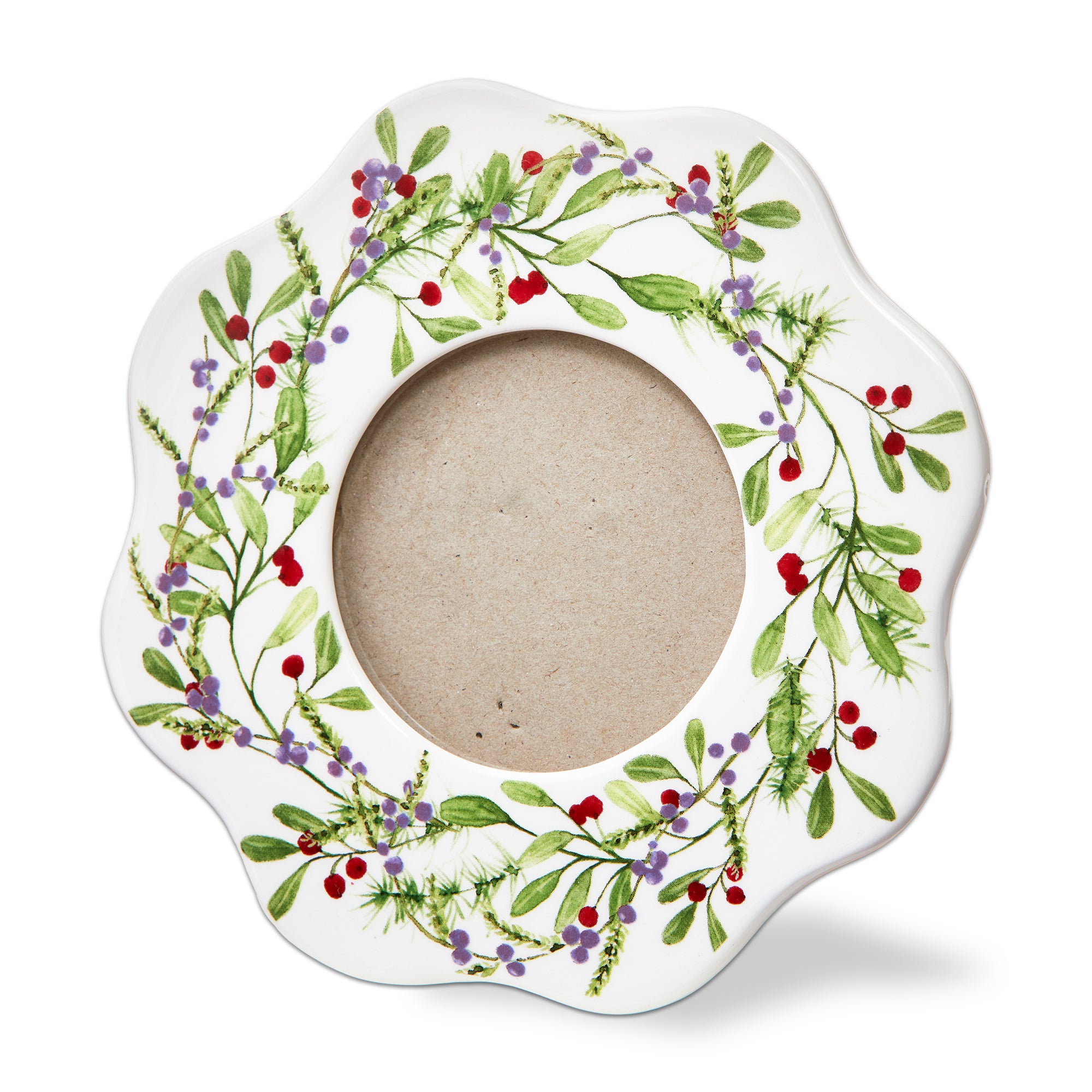Round earthenware wreath frame that highlights small seasonal photos. Sculpted berries and greenery create a festive border while the glass front protects a 3 by 3 picture. Perfect for shelves, mantels, or gifting. Hand painted details add warmth while its versatile design makes styling simple. Sized for layered displays and pairs beautifully with seasonal greenery and décor. View all items in Winter Berries.