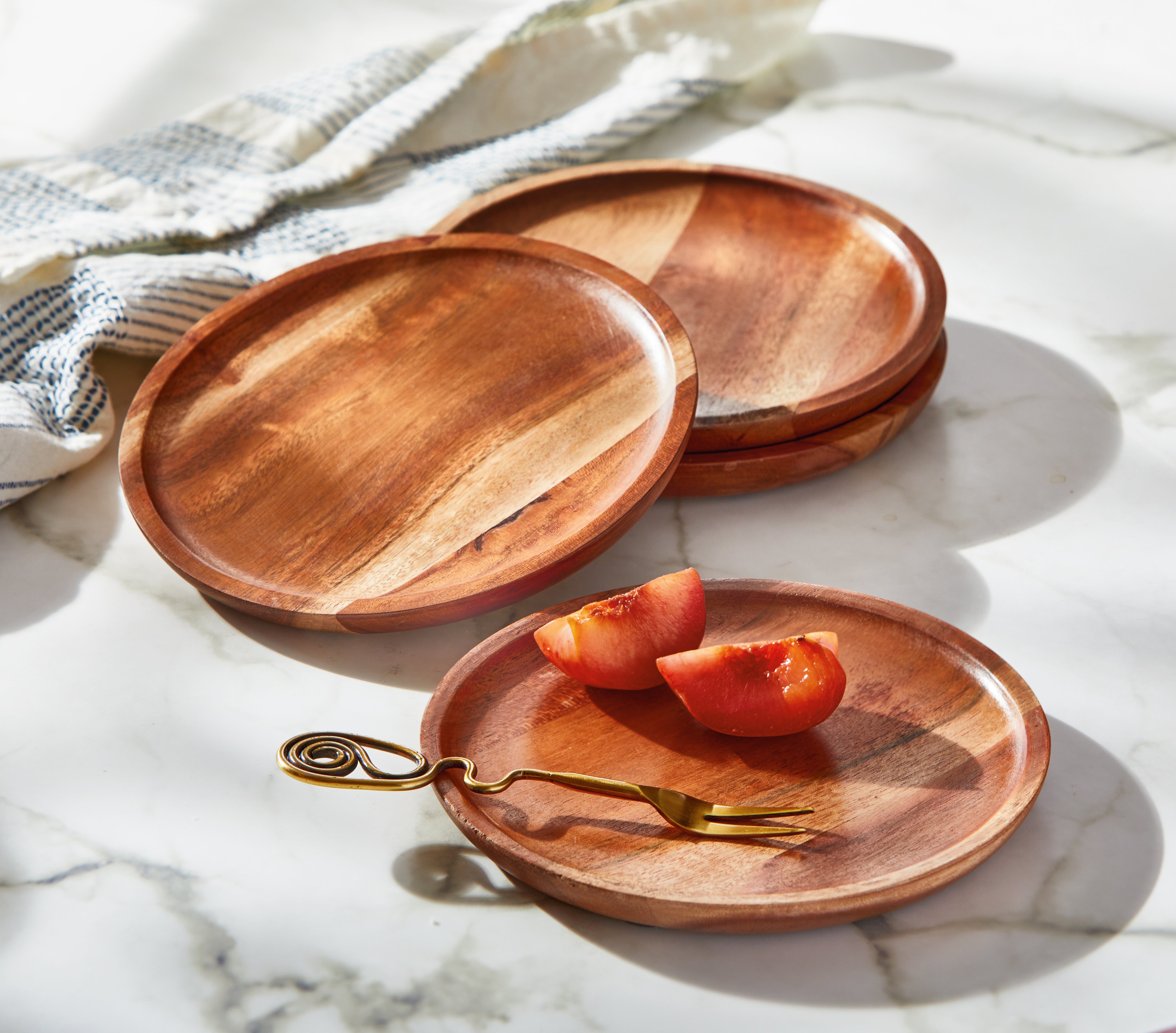 This set of acacia wood plates adds a touch of elegance to any dining occasion. artisan-made and food-safe, these plates are perfect for serving appetizers, desserts, or main courses. hand wash and apply mineral oil to maintain the wood's beauty and prevent drying.