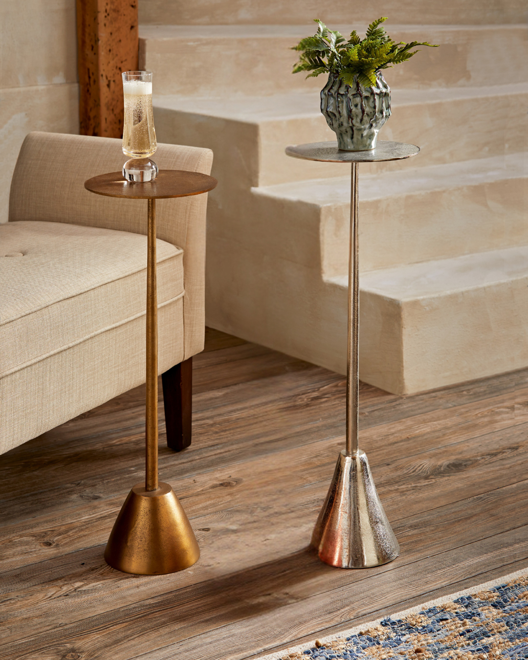 This medium aluminum antique brass side table is the perfect addition to any living room or entertainment space. the sleek and modern design is complemented by the warm antique brass finish, creating a look that is both stylish and sophisticated.