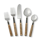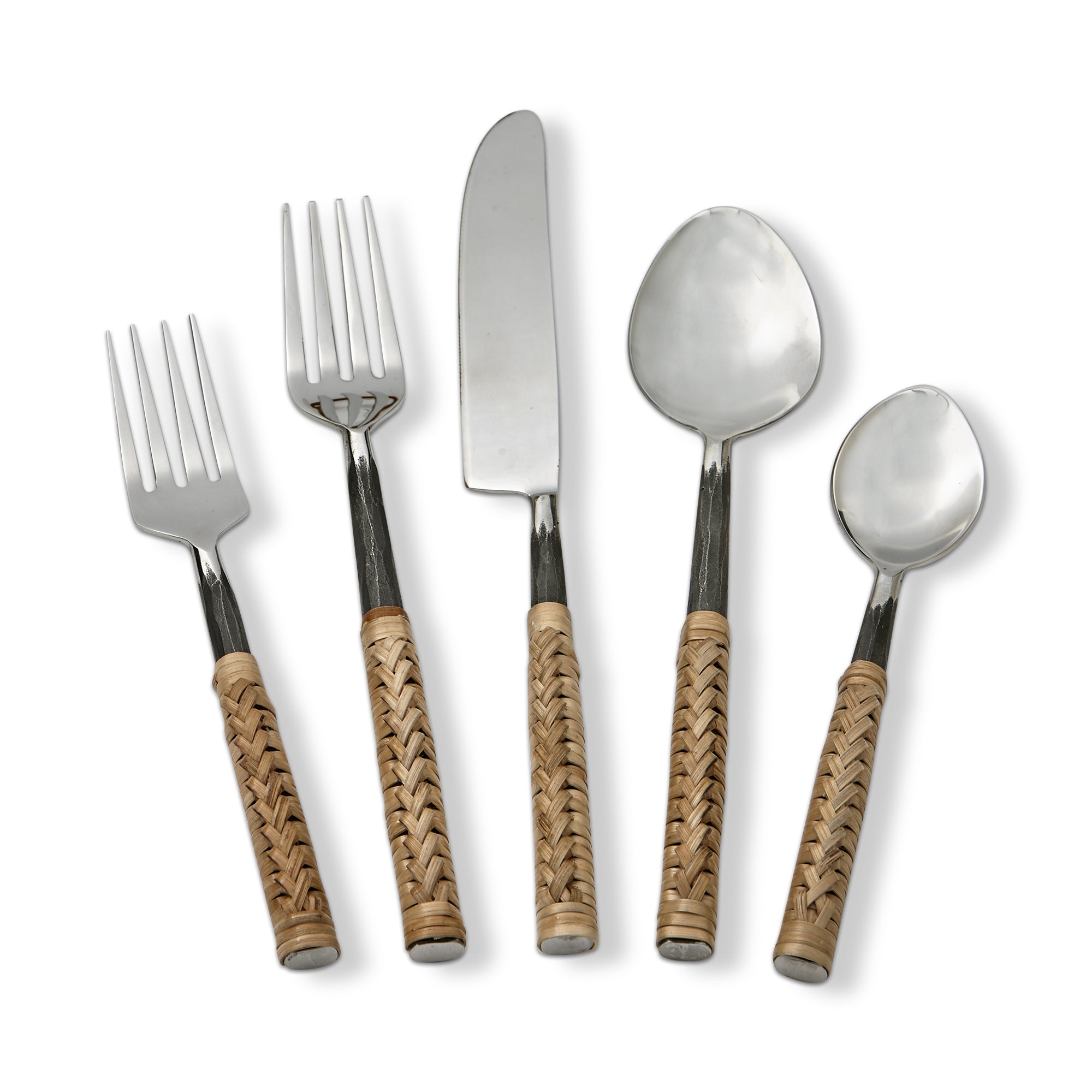 New! beautiful artisan-made bamboo and stainless steel flatware. hand forged, featuring handwoven bamboo handles. set includes: 1 salad fork, 1 dinner fork, 1 teaspoon, 1 soup spoon, & 1 dinner knife.